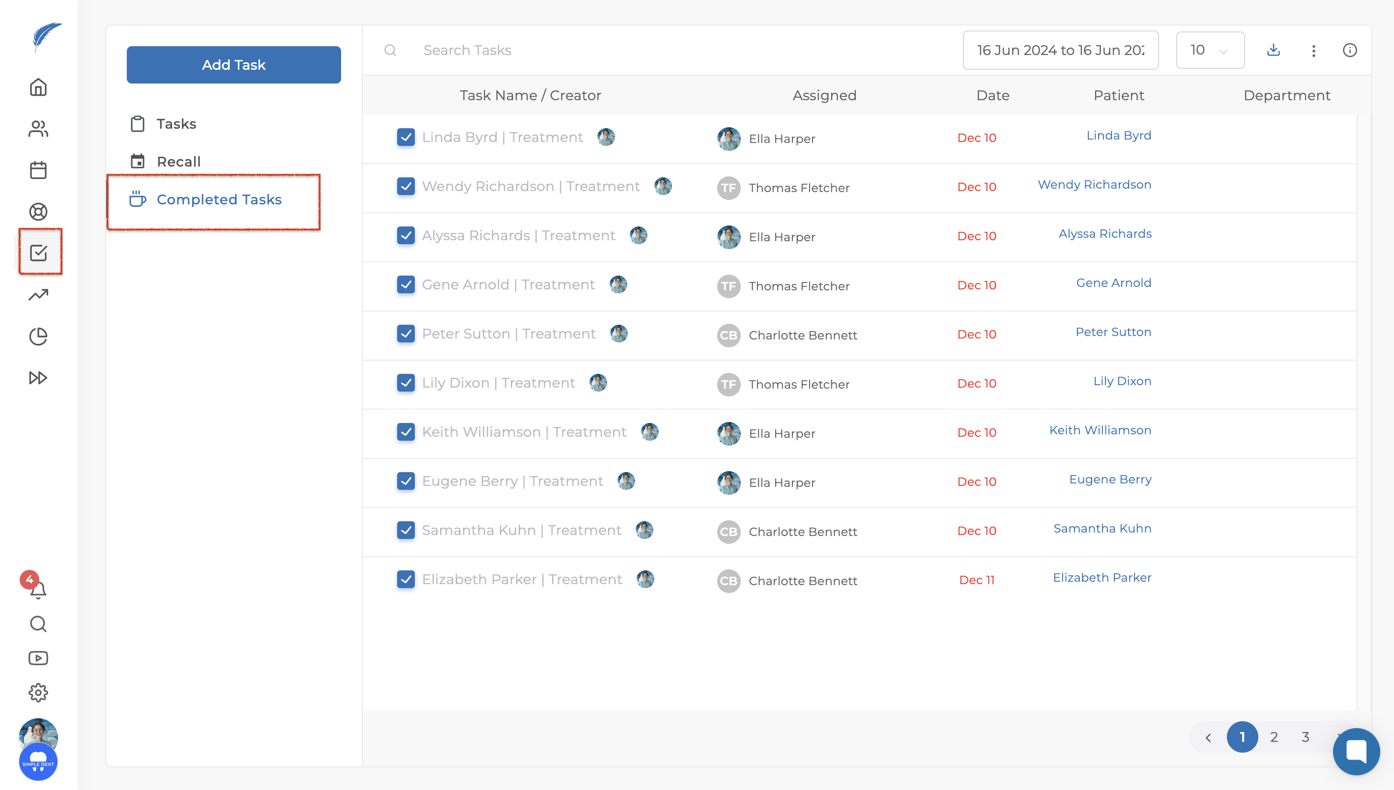 To list completed tasks across the clinic, use the "Completed Tasks" tab in the tasks screen. In this view, completed tasks are listed sequentially. The layout is divided into columns including task name, assigned person, due date, relevant patient, and relevant department.