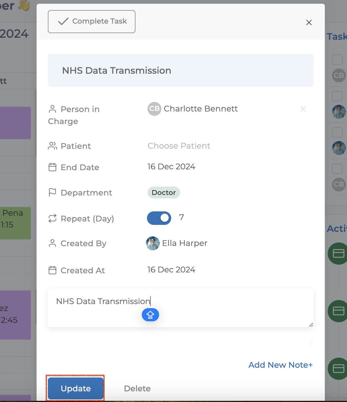 If there are any changes to the task, you can make the necessary adjustments and click the "Update" button to save the changes. If there is an incorrectly created task, you can click the "Delete" button to remove that task and then create a new one by following the same steps.