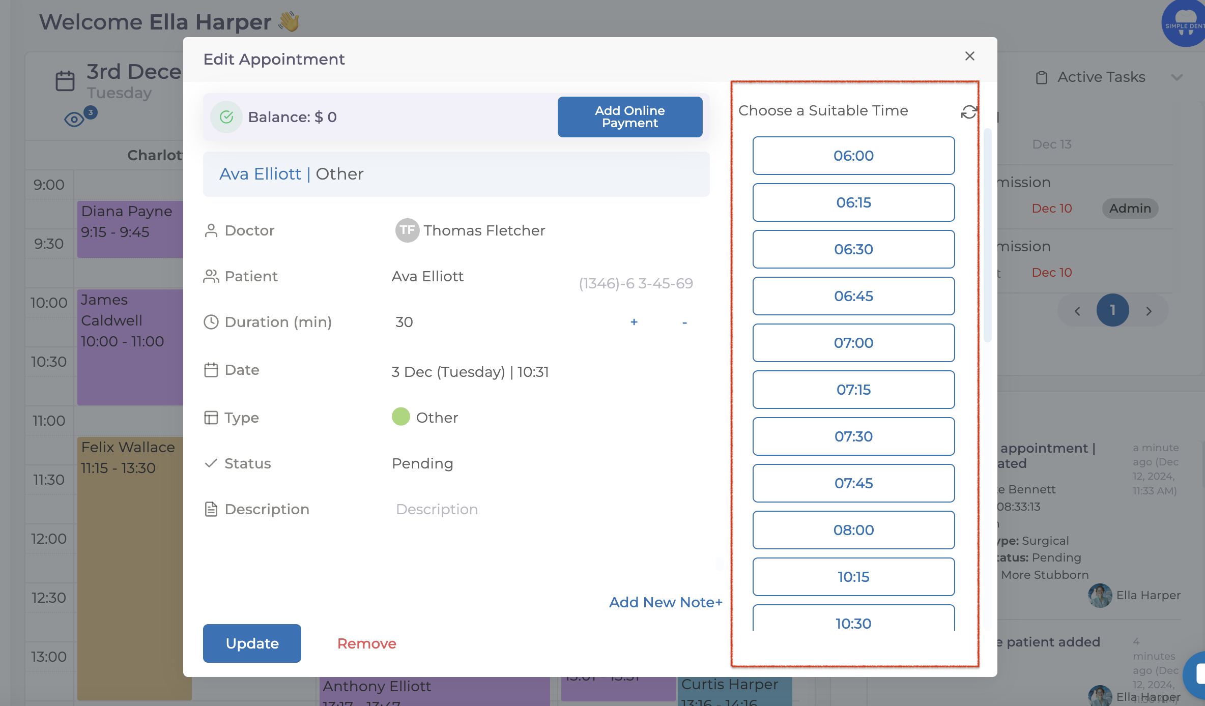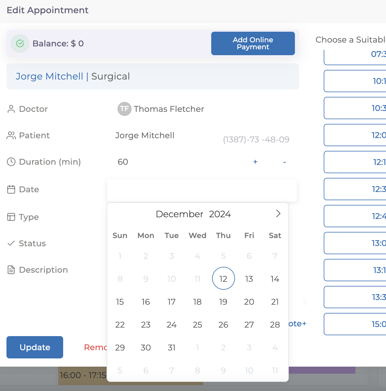 After selecting the appointment time on the right side of the screen for the new date, click the Update button to assign the new appointment date.