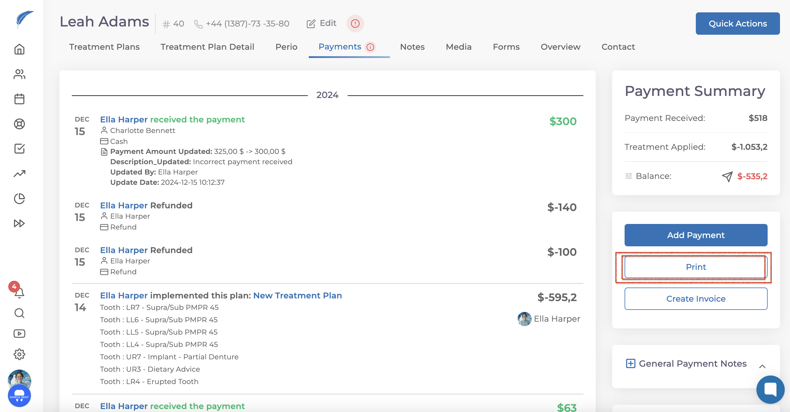 On the right side of the screen, you can print all the transactions the patient has made in the past using the "Print" button.