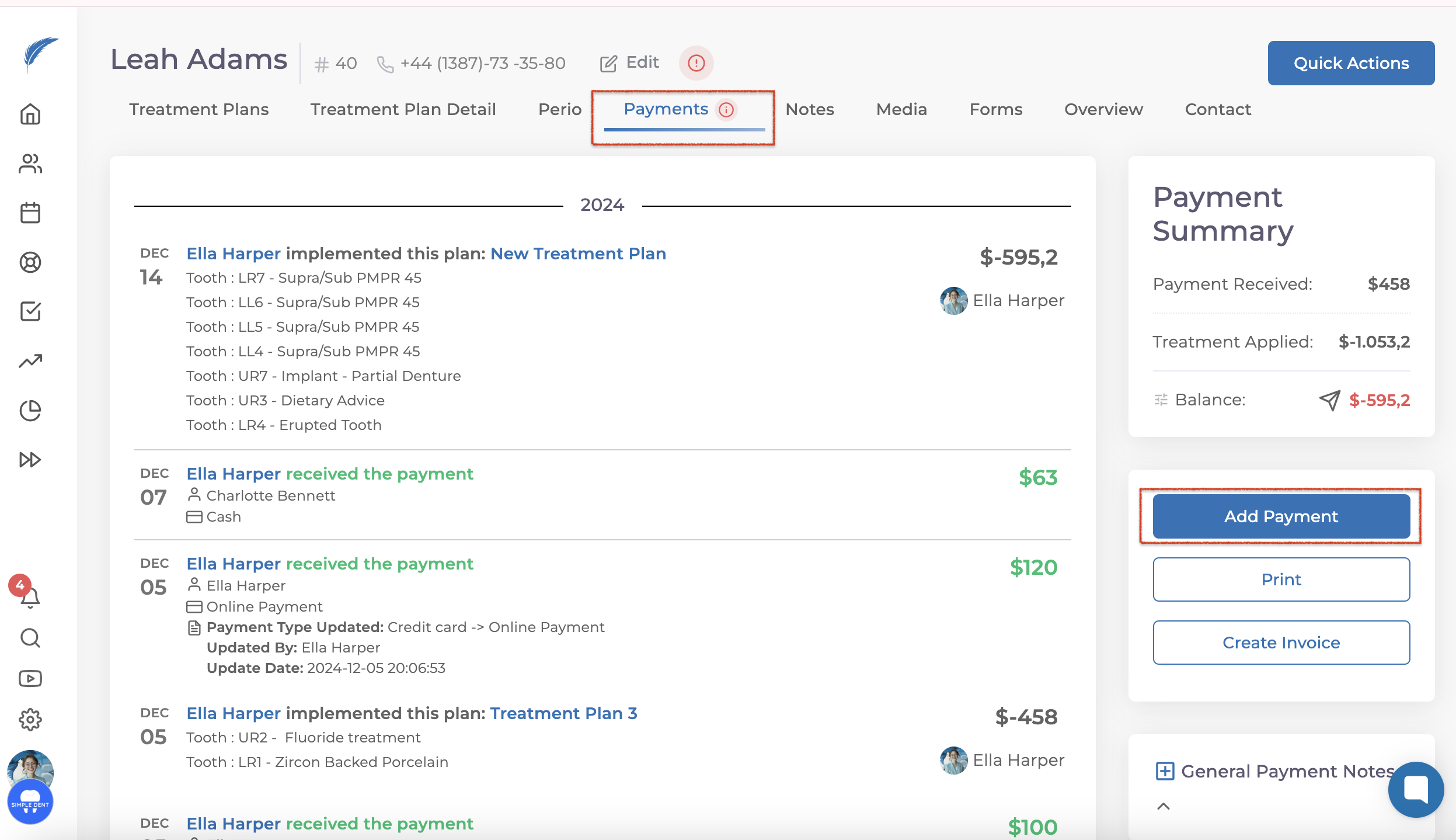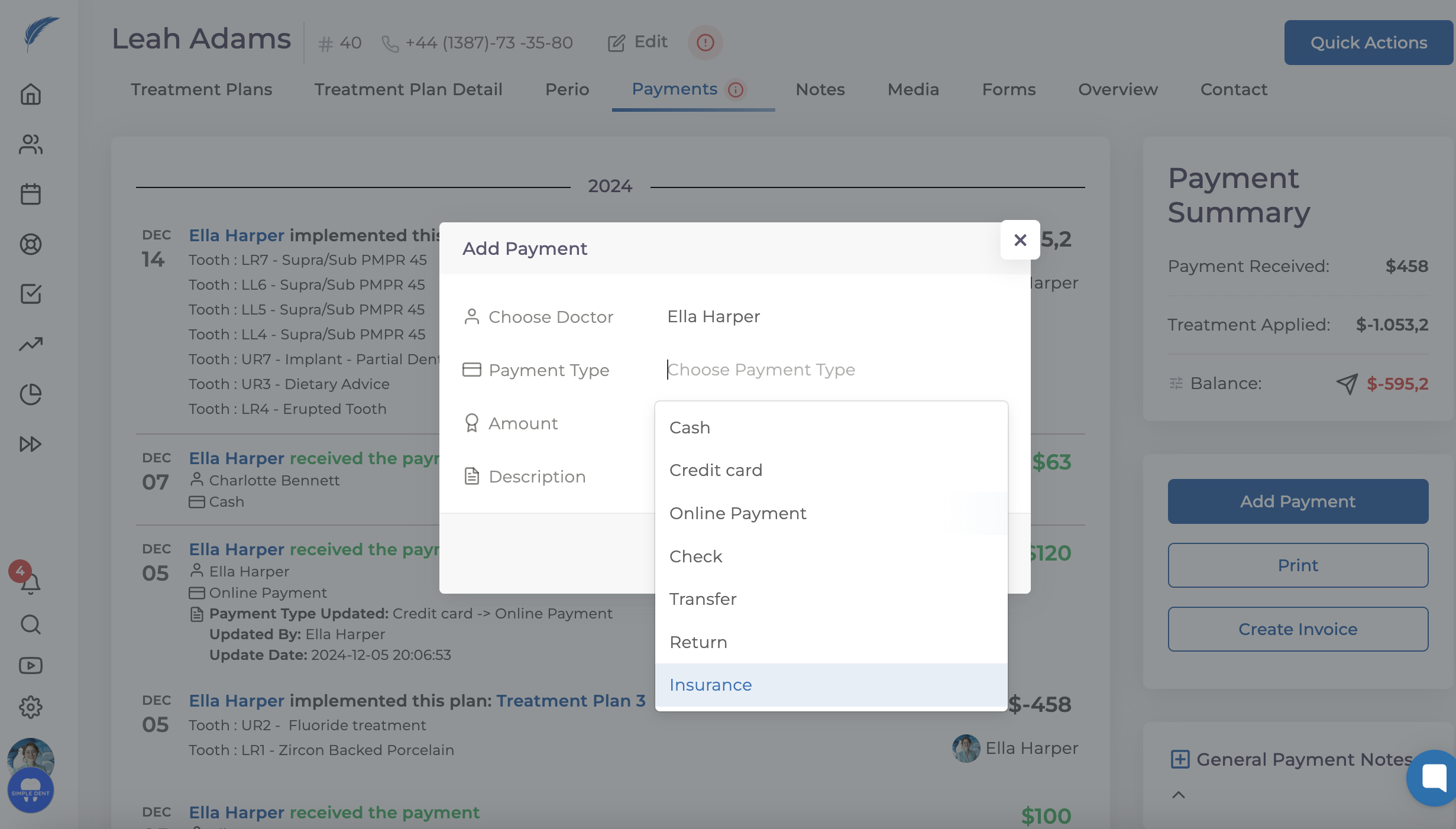 To issue a refund, you need to click the "Add Payment" button in the patient's profile. In the window that opens, select "Refund" at the bottom of the Payment Types.