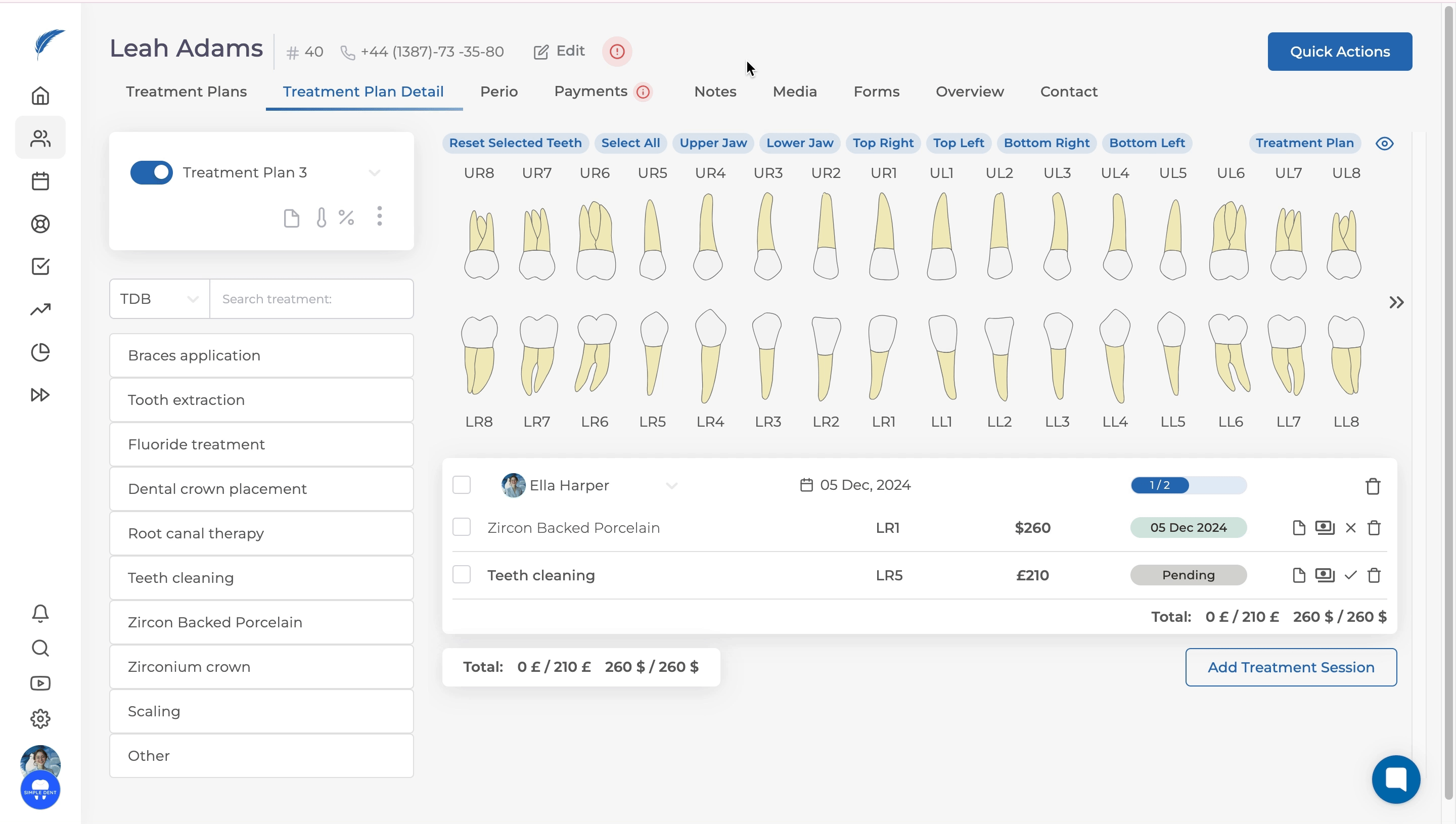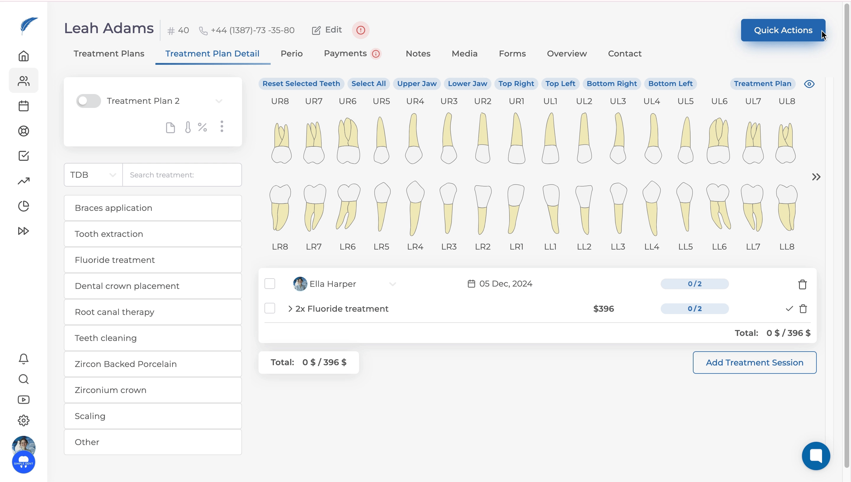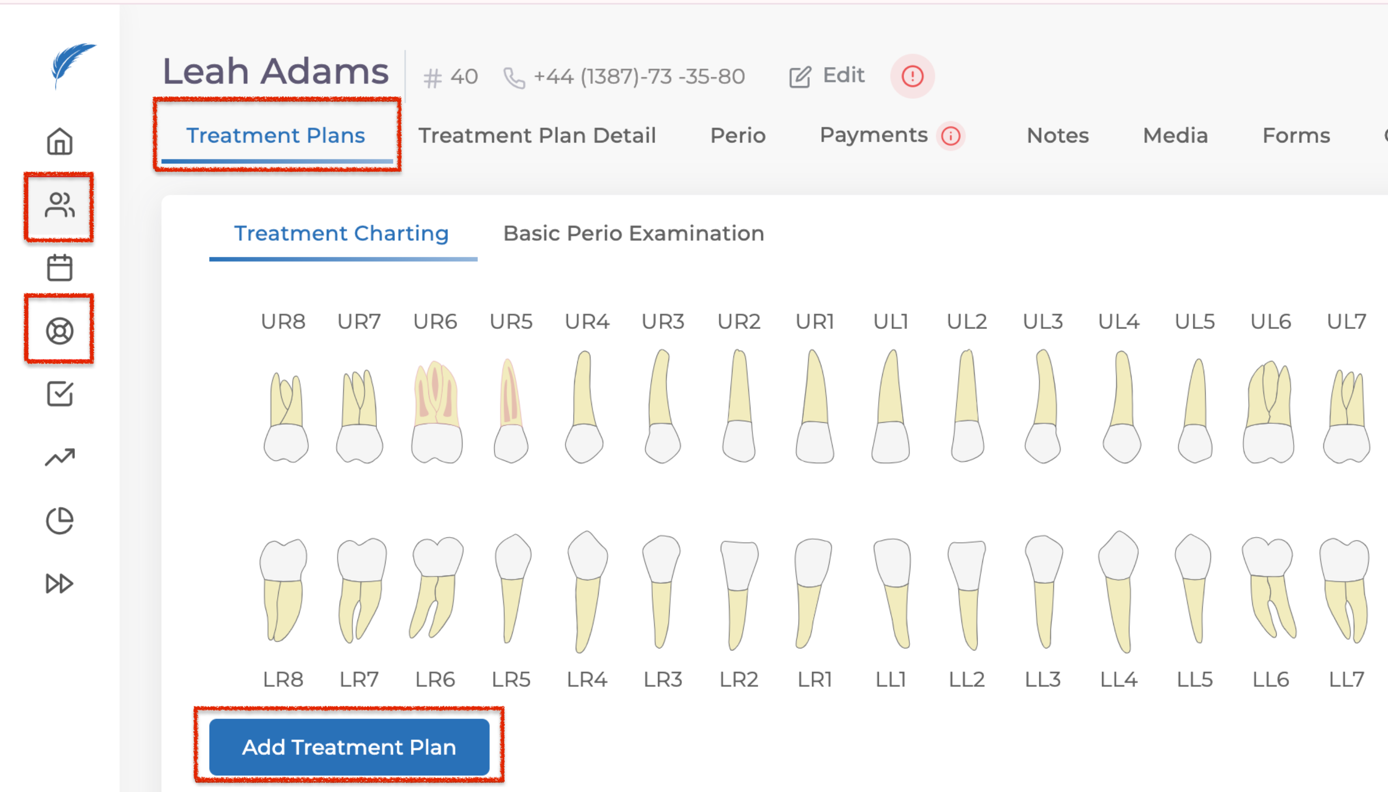 On the treatment plan screen, the left side displays treatments, the top right shows the dental chart, and the bottom right area lists the treatments. There are ways to prepare the treatment plan. Below, you can find two of the options along with videos.