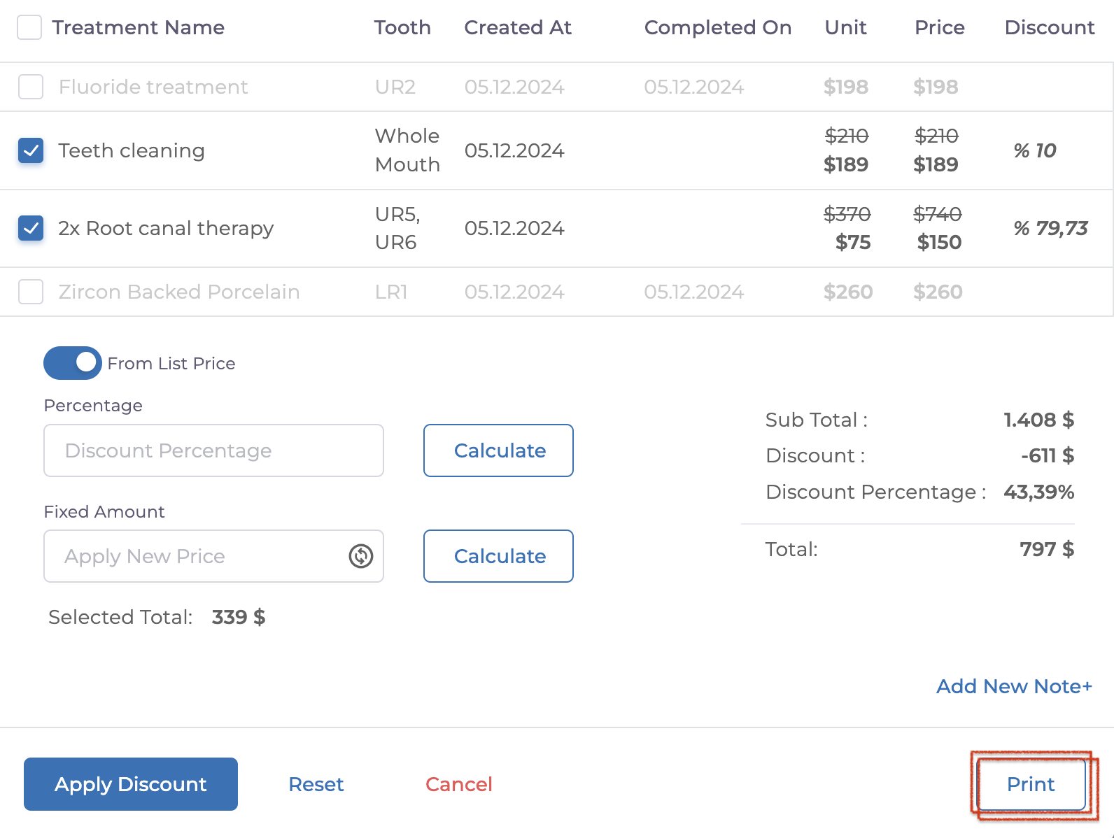 The first method is to use the "Print" button located where the discounts are applied. After completing the discounts and saving the treatment plan, you can print the output using the print button.