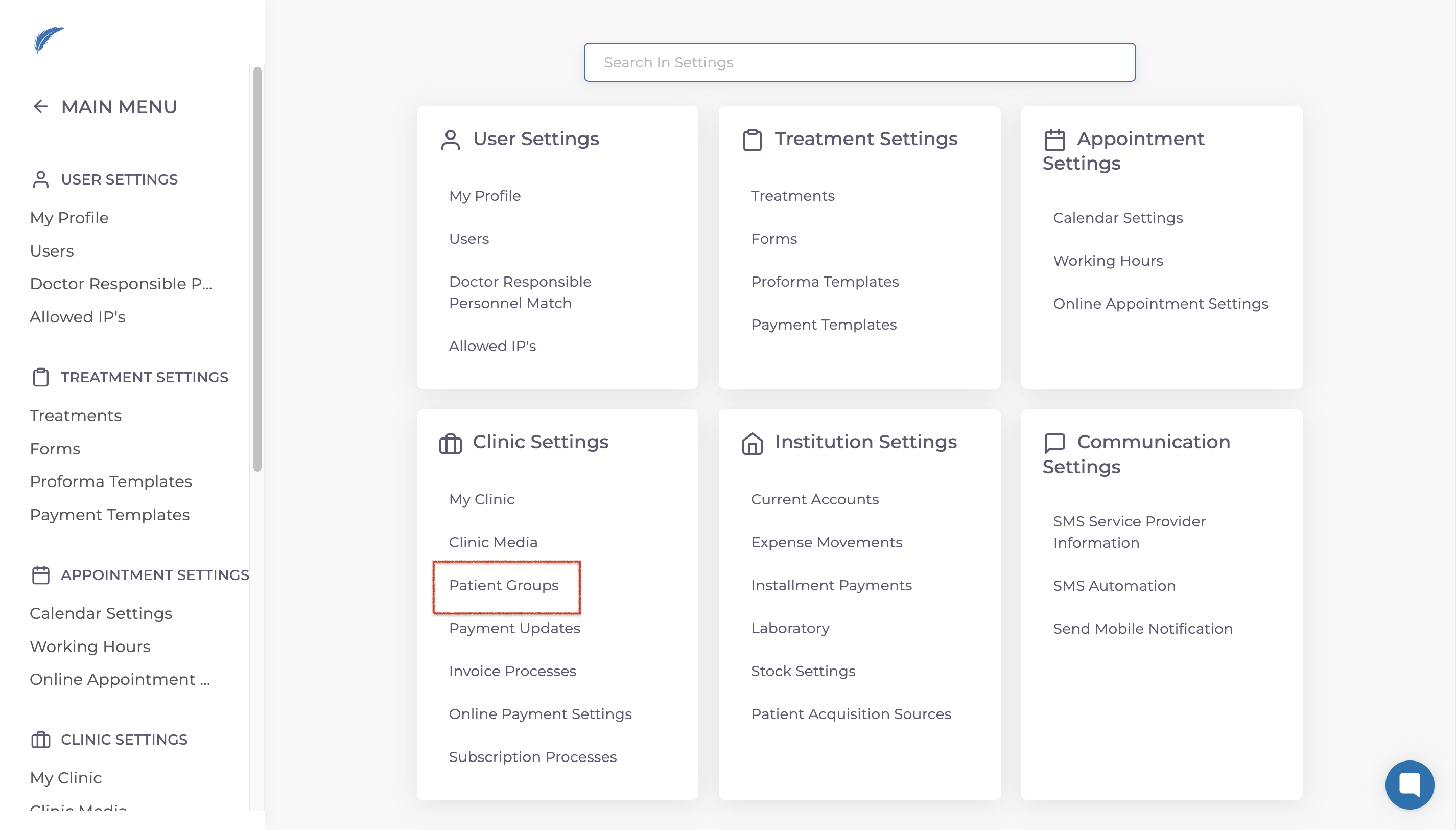 To create a patient group, first, go to the "Settings" menu, then navigate to the "Clinic Settings" section and select "Patient Groups”.