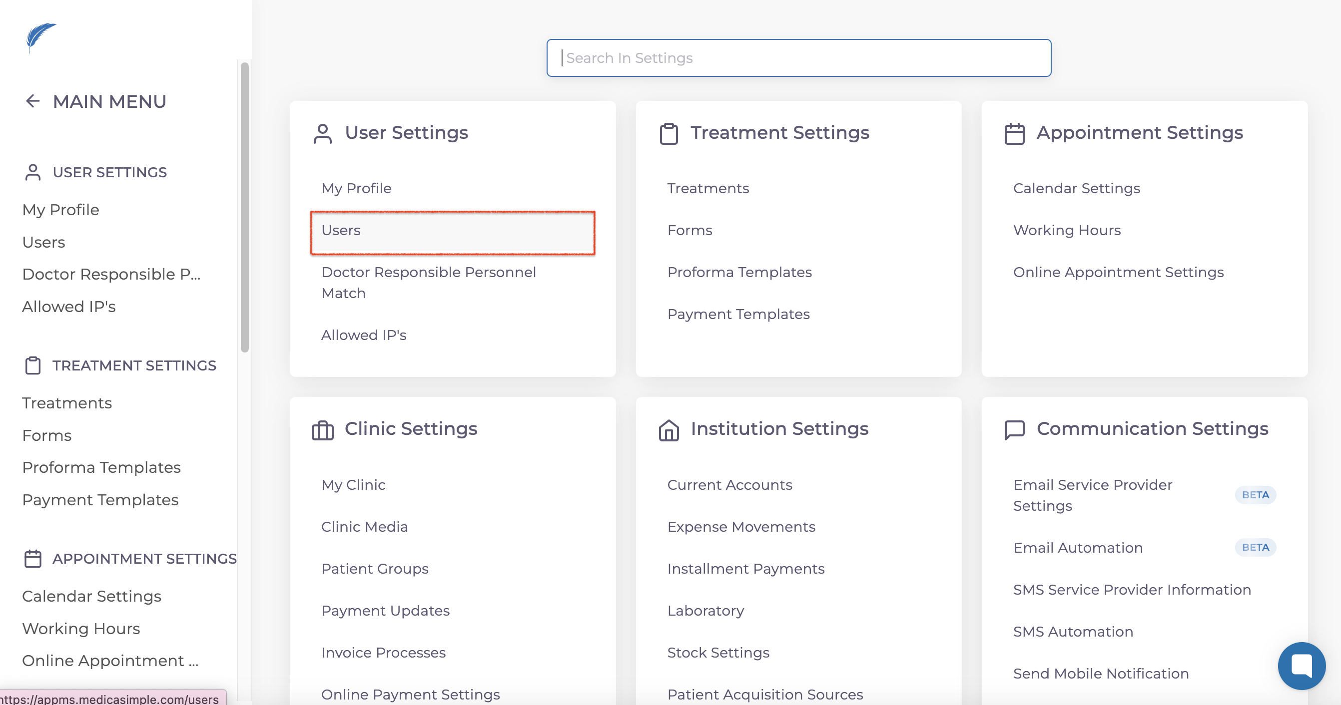 To change clinic settings, first navigate to the "Users" section under the "User Settings" tab in the Settings menu.