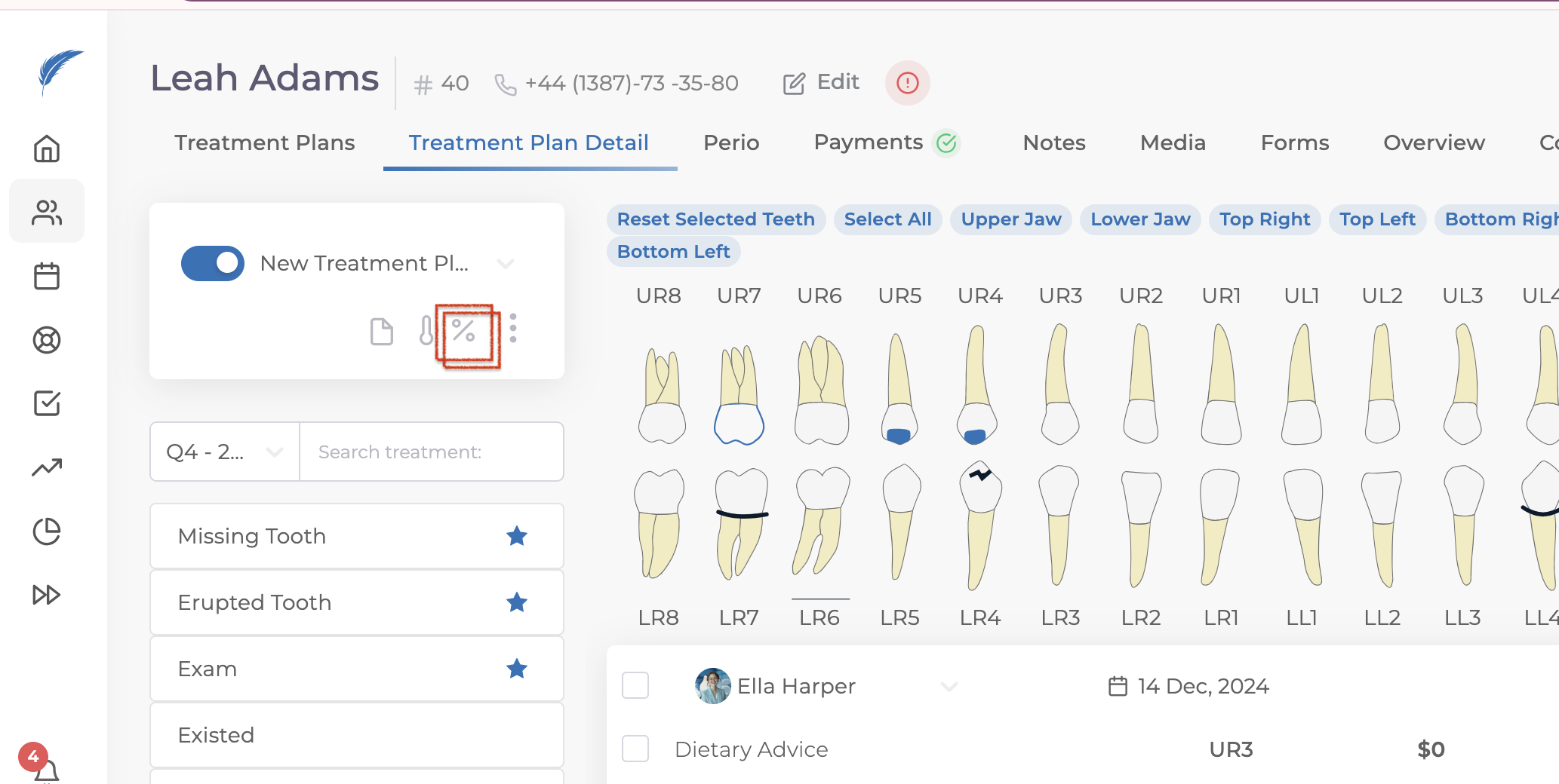 To view the account details, you first need to access the patient's treatment plan. On the treatment plan page, click the '%' symbol located to the right of the patient's name.