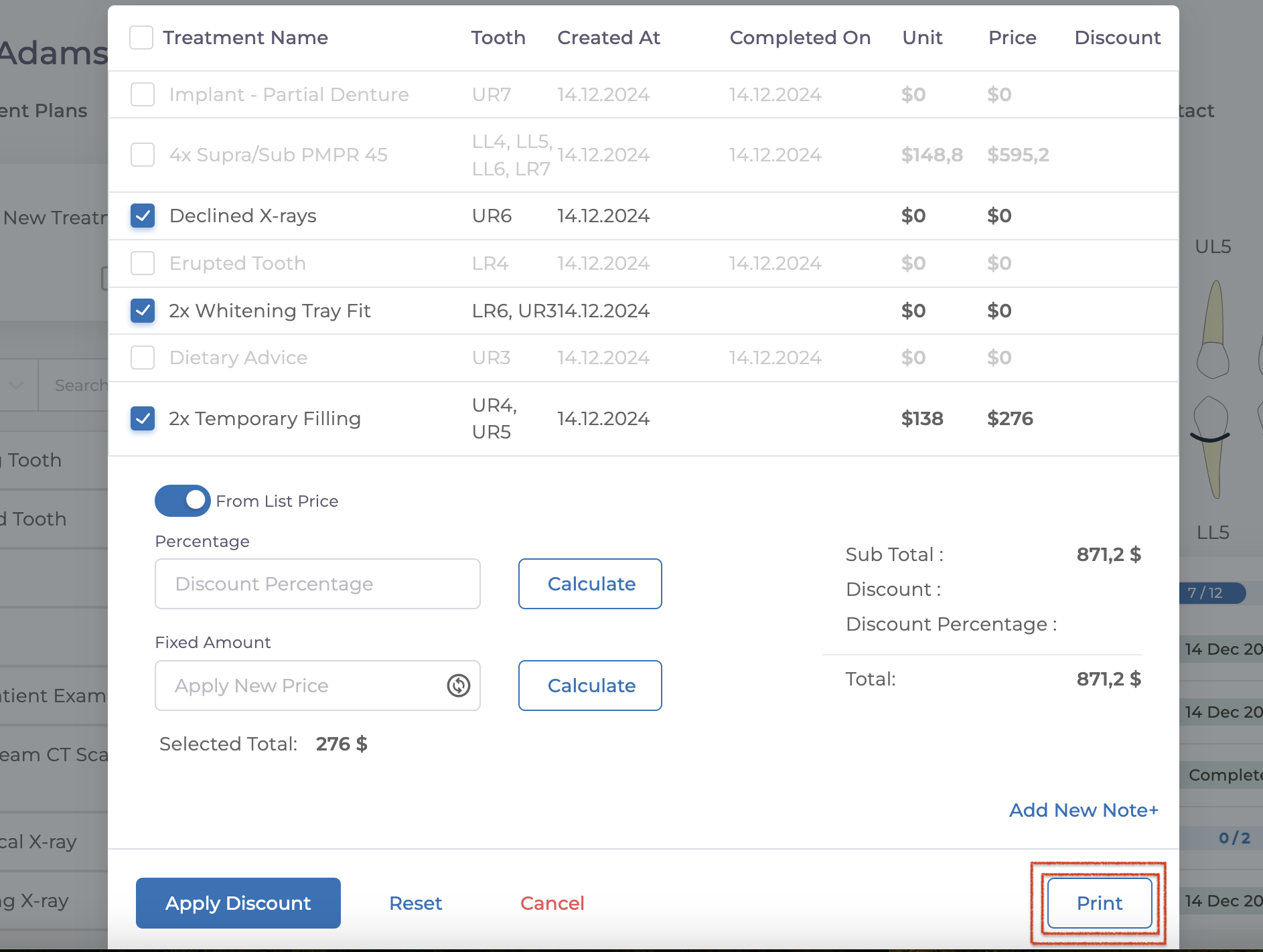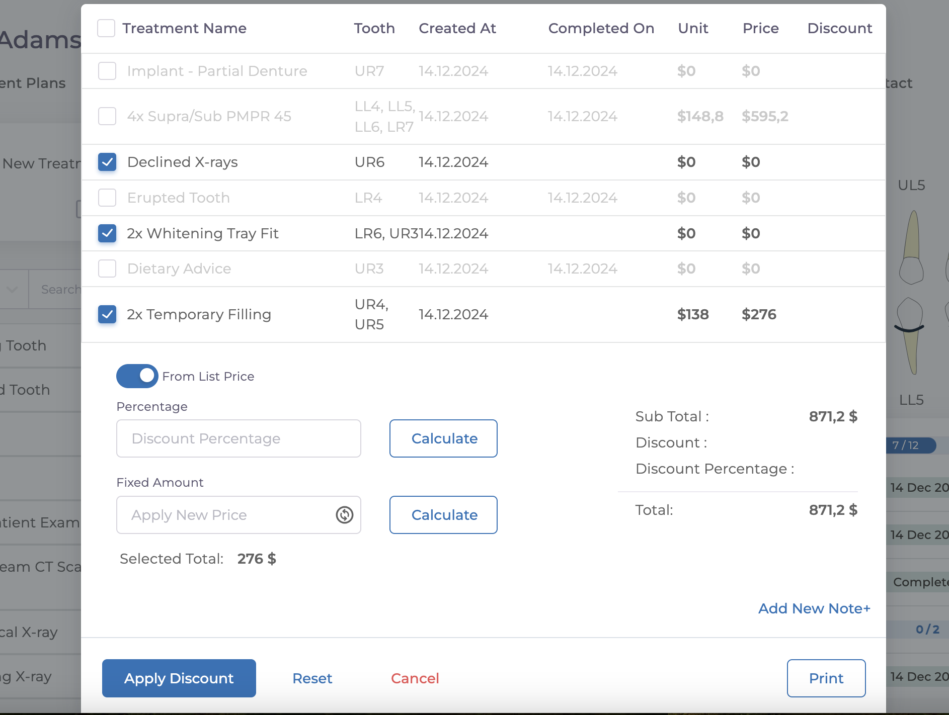 With the account details, you can view all treatments applied to and planned for the patient in a single list; you can review which tooth each treatment was applied to, the treatment duration, unit and total prices. Additionally, from the account details list, you can apply a percentage (%) discount to selected treatments or define a New Price for each selected treatment.