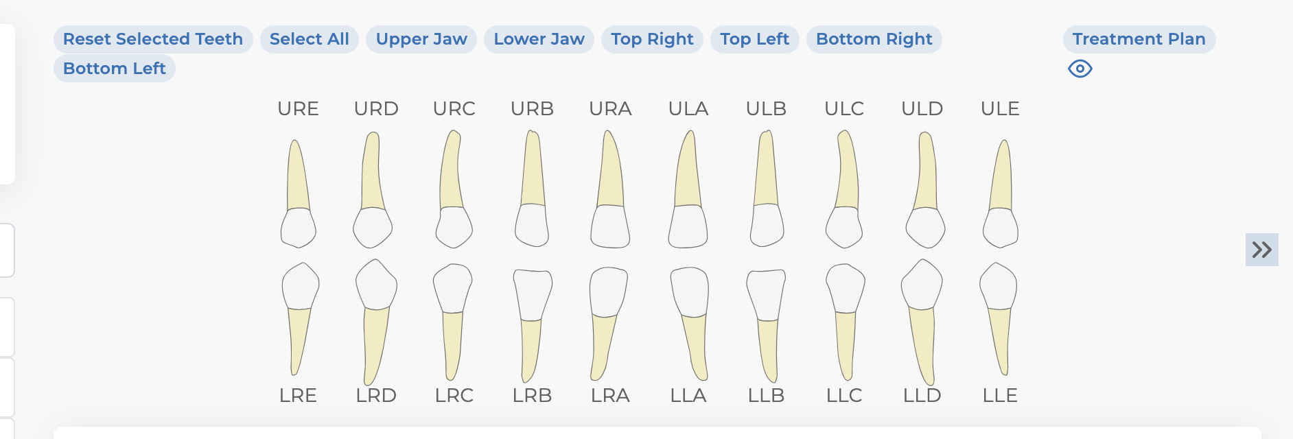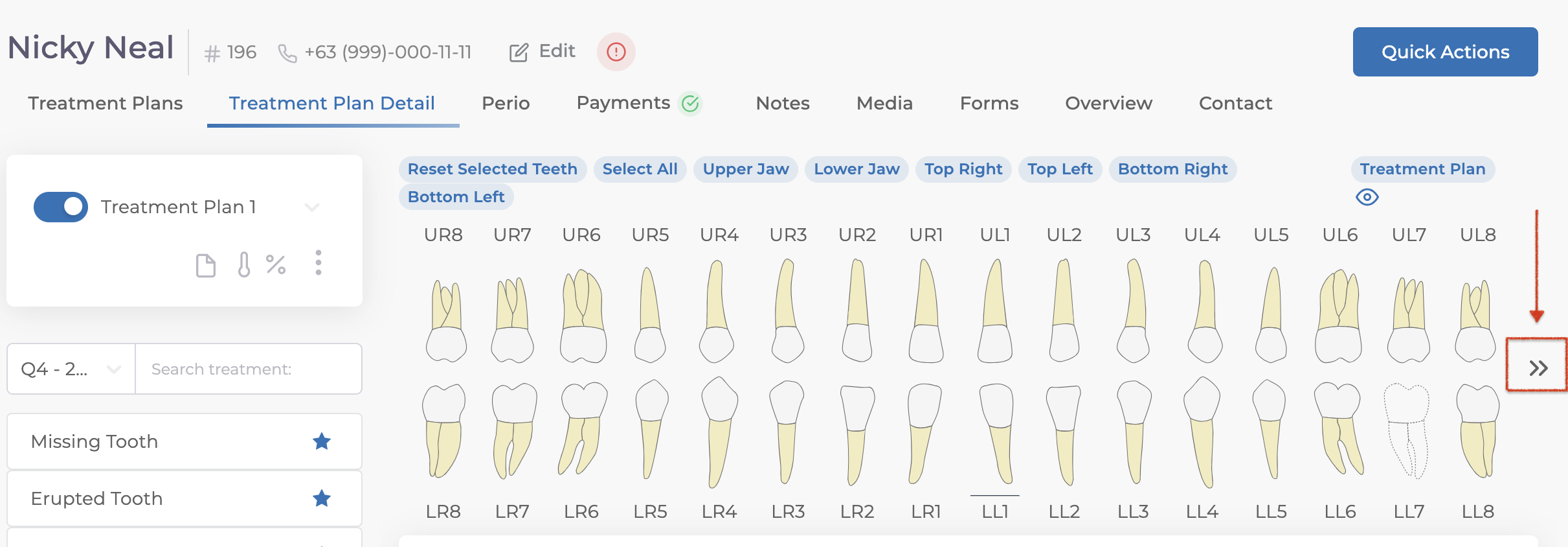 When you enter a treatment plan, the standard treatment plan and adult tooth chart will automatically appear. To switch to the pediatric treatment planning screen, you need to click the " >> " button located to the right of the tooth chart.