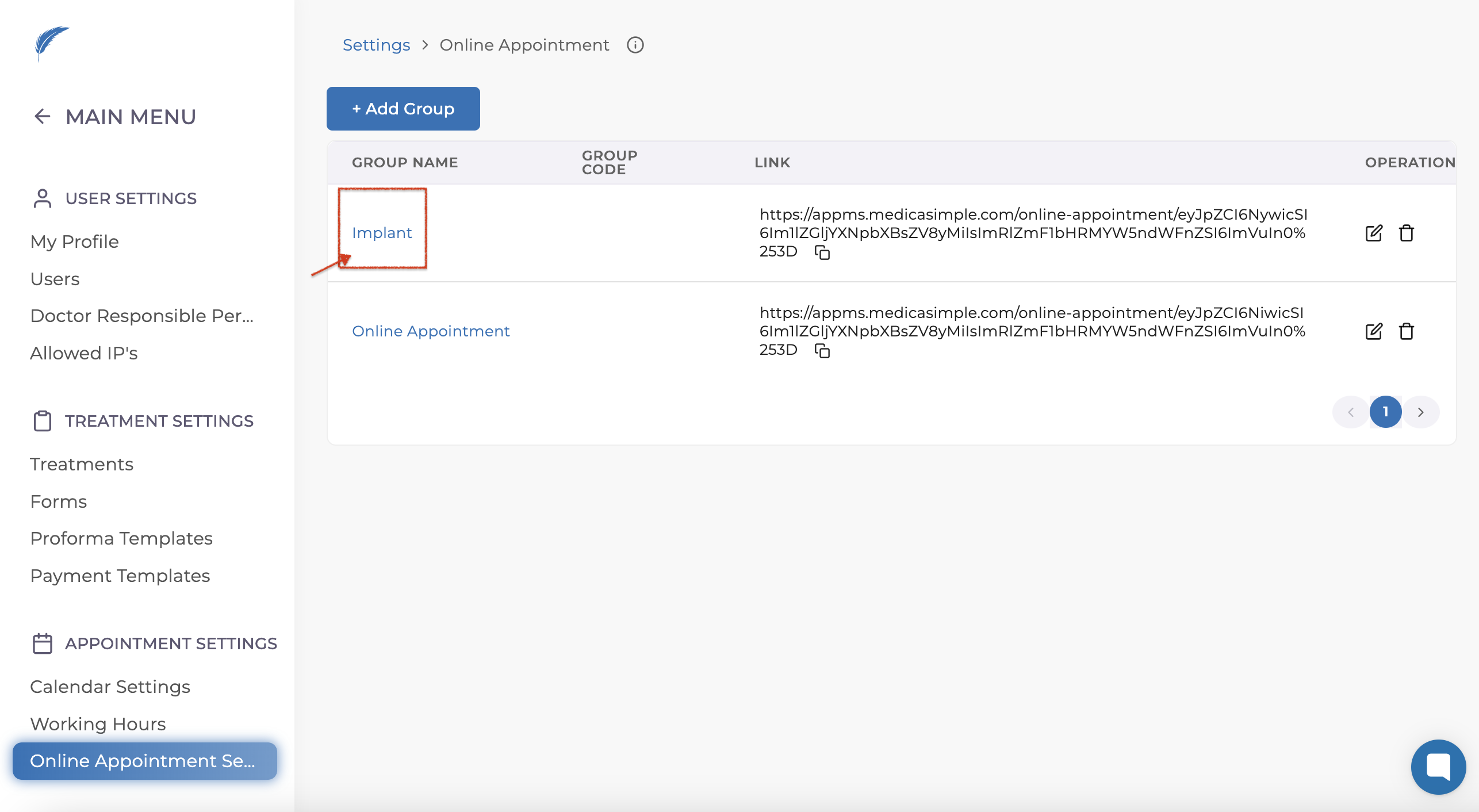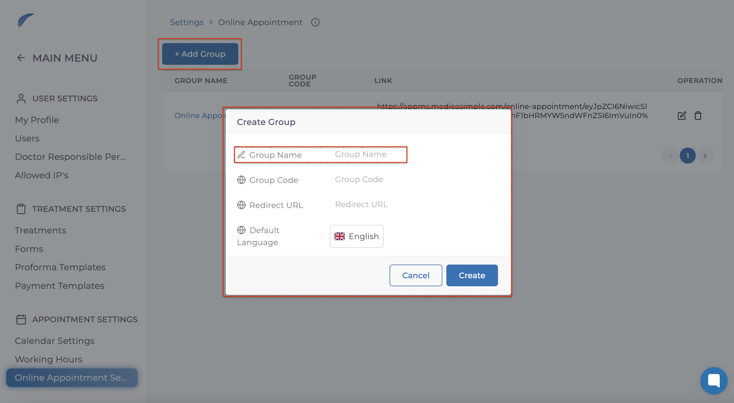 If you haven't created one before or if you want to create a different online appointment link, first go to the Settings - Online Appointment Settings section. Click on the "+ Add Group" button. In the window that opens, you need to specify a name for the link you are going to create. After setting the name, click on "Create" to generate the link.
