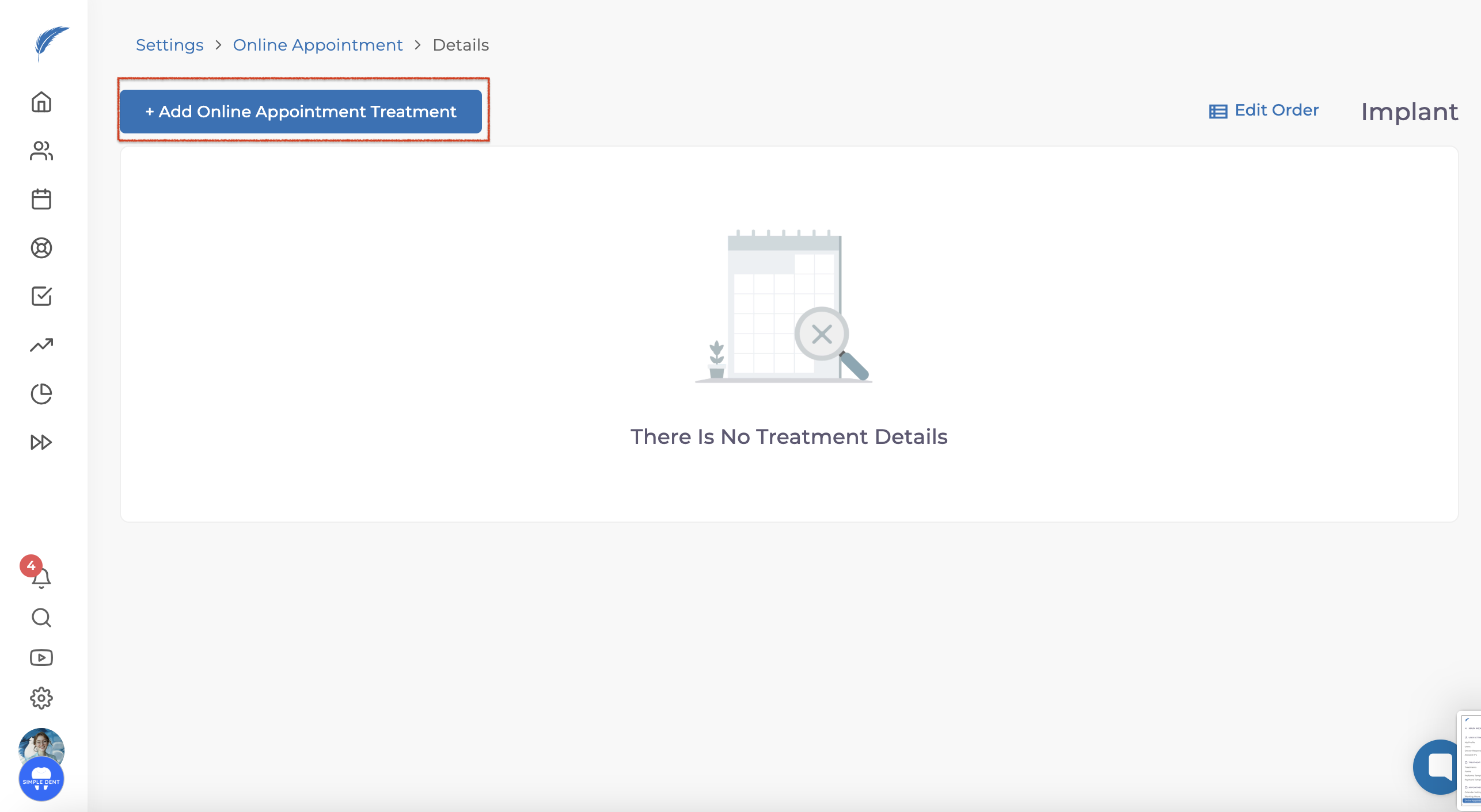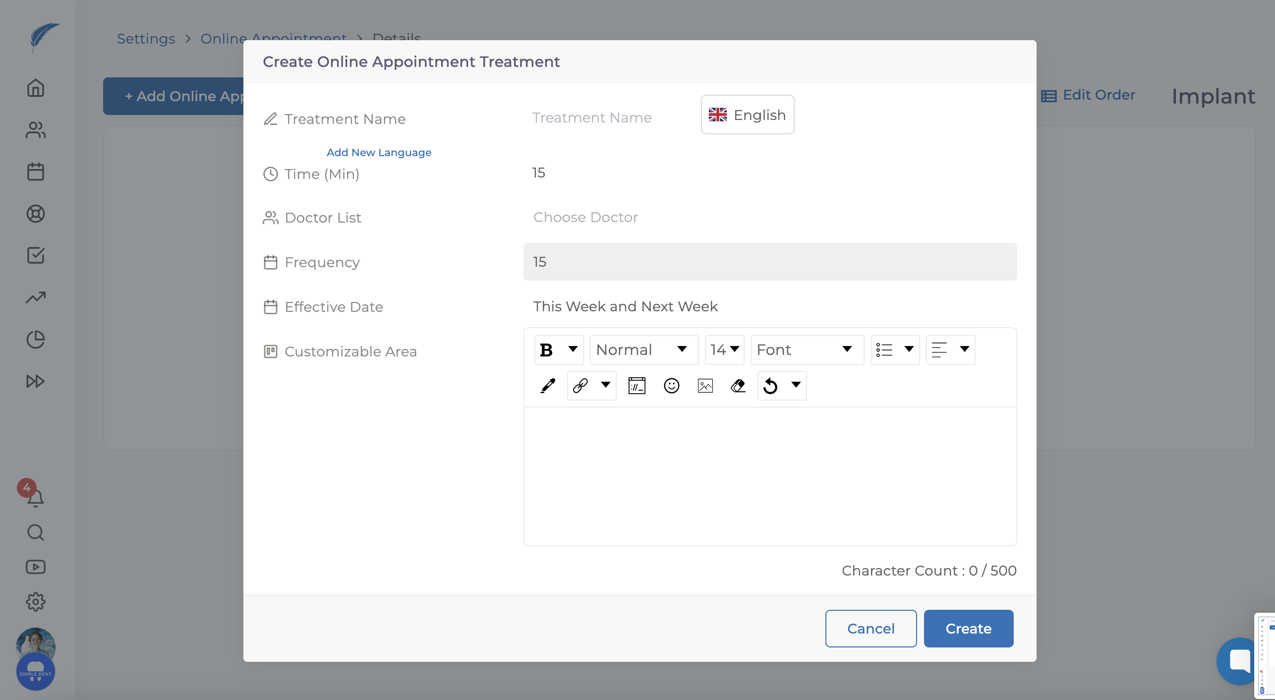 Click on the "Add Online Appointment Treatment" button. In the window that opens, you can specify the treatment, treatment duration, the doctor performing the treatment, the frequency of appointment slots, and the date until which appointments can be selected.