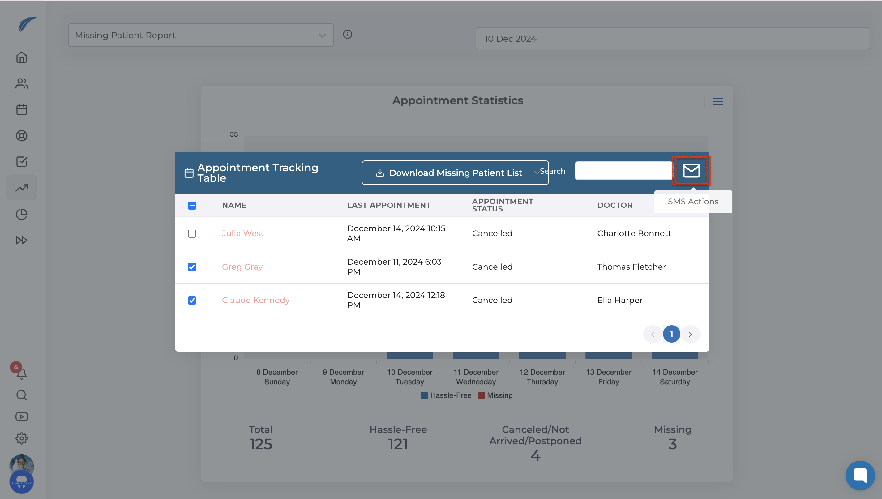 To perform actions with your missing patients, there is a checkbox next to each name. You can select either all patients or specific ones you choose. When you select any patient from this list, the "SMS Actions" button at the top will become active.