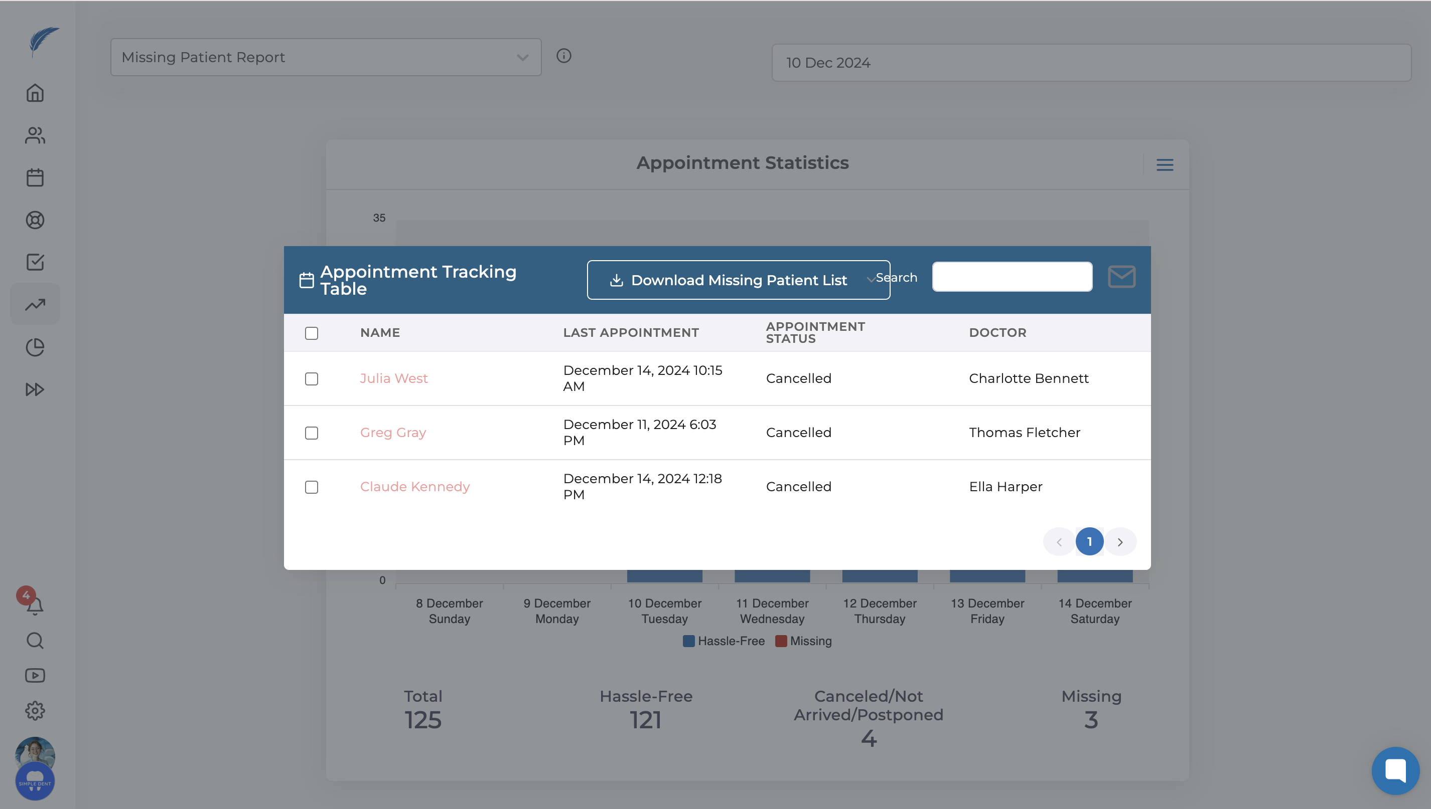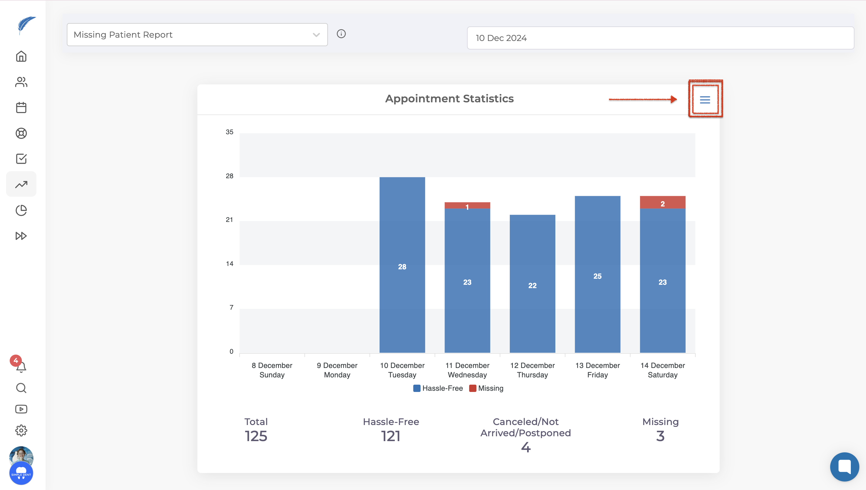 First, open the lost patient report page. Click on the three lines next to the "Appointment Statistics" graph. From the dropdown list, select "Missing Patient List," and a window will open listing the patients who missed their appointments.