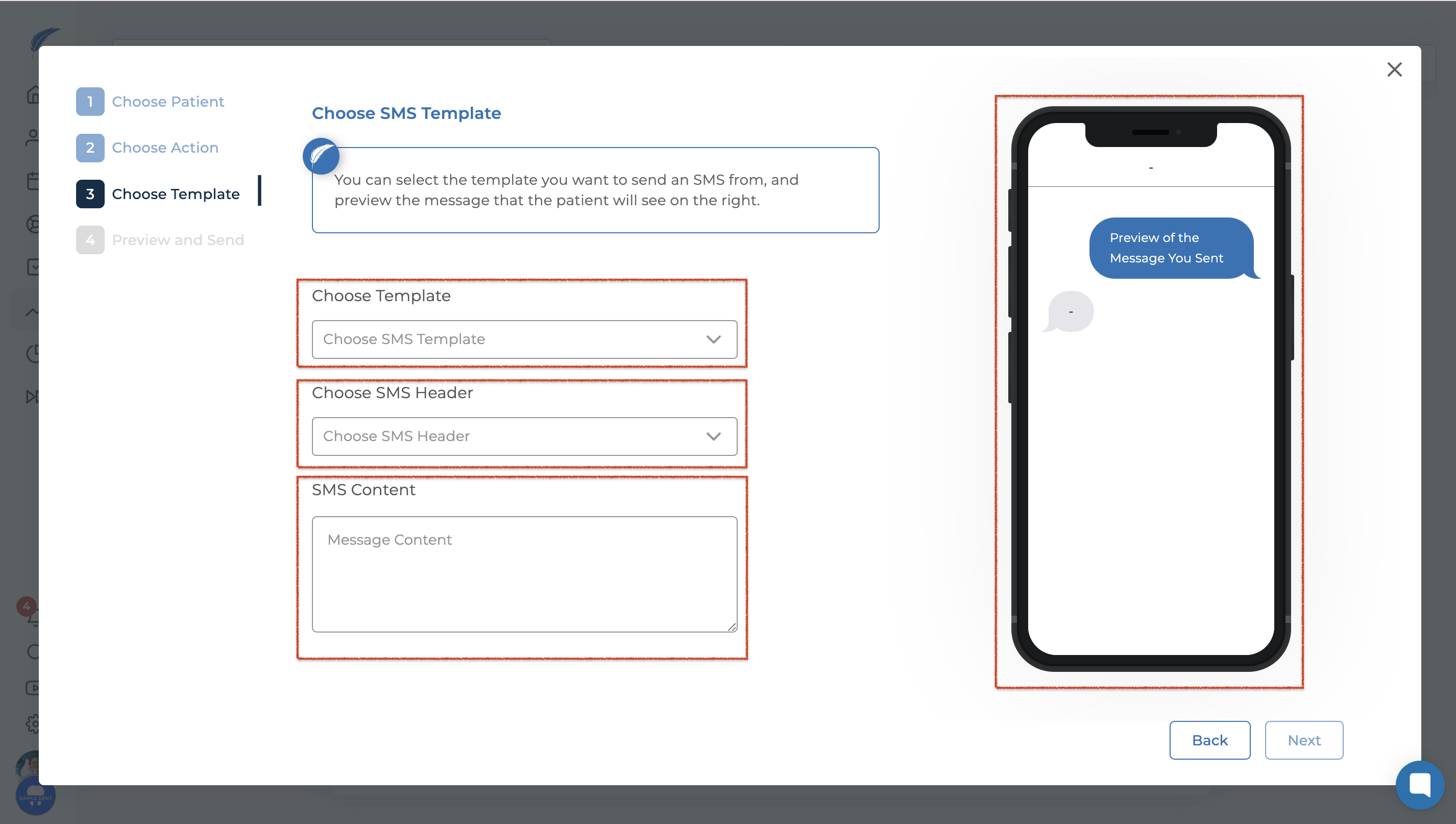 In the third step, you need to select a template to send SMS messages. You can choose a template created for missing patients or modify an existing template without creating a new one. For information on editing your SMS templates, refer to our "SMS Automation - Template Creation" article.