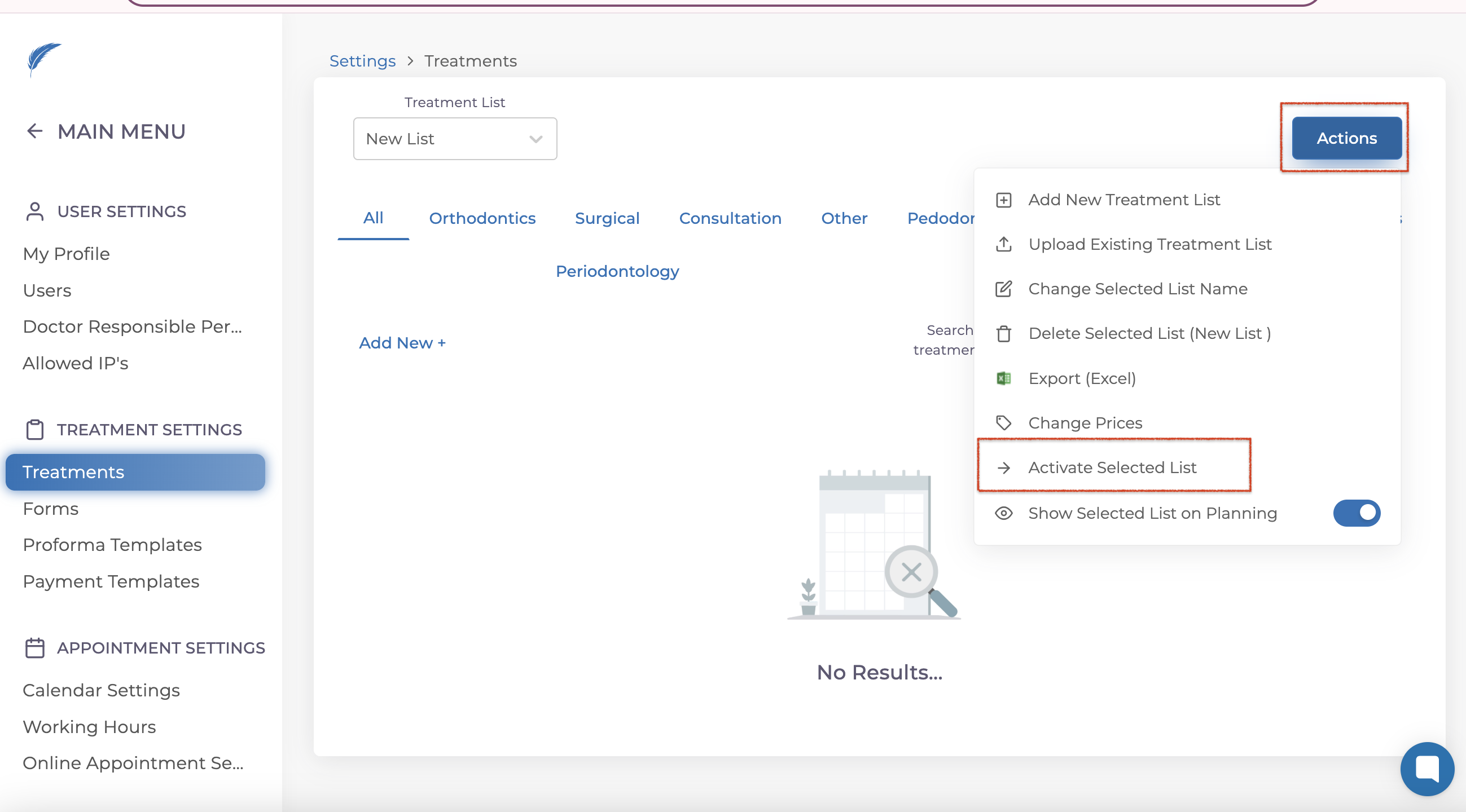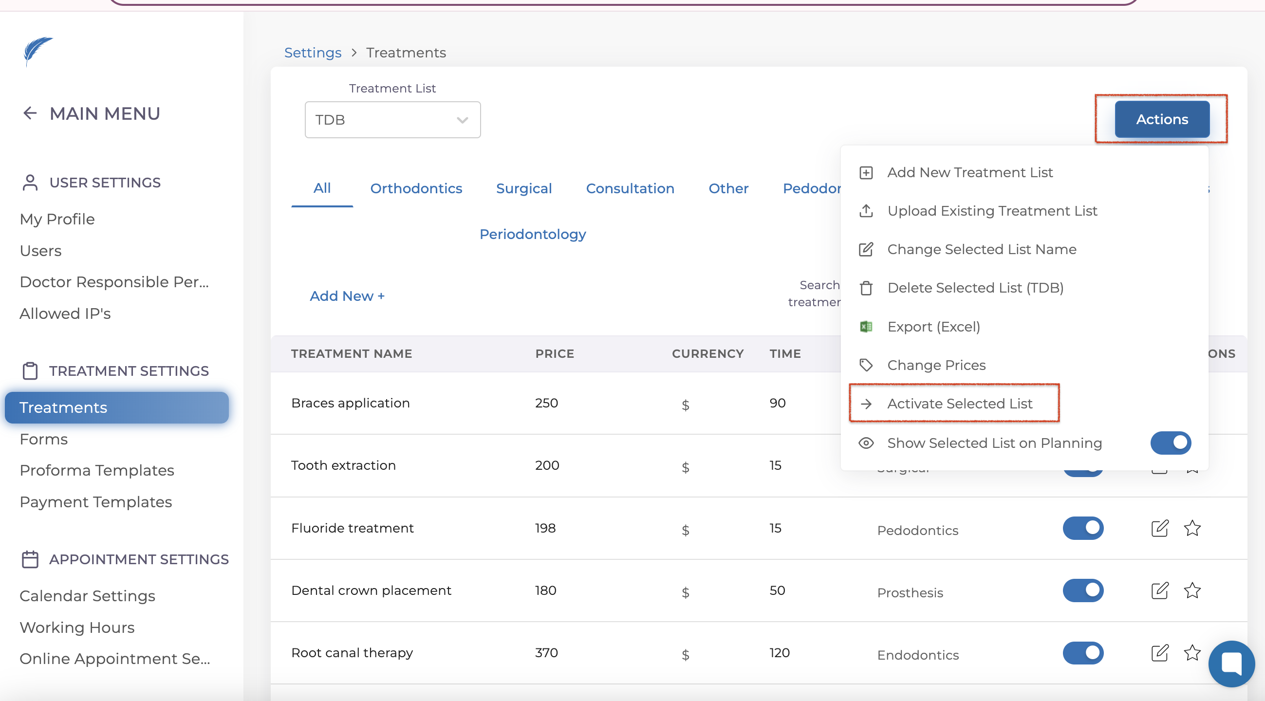 After creating your list, select your custom list from the list selection section and click the "Activate" button. This way, you will only see personalized treatments in the treatment plans you create.