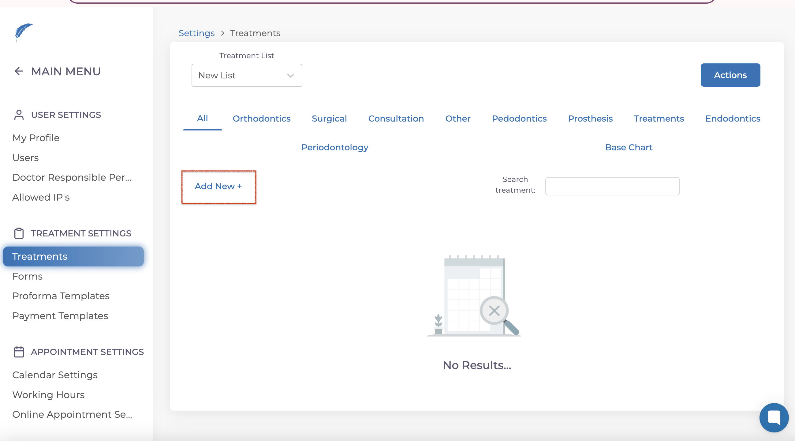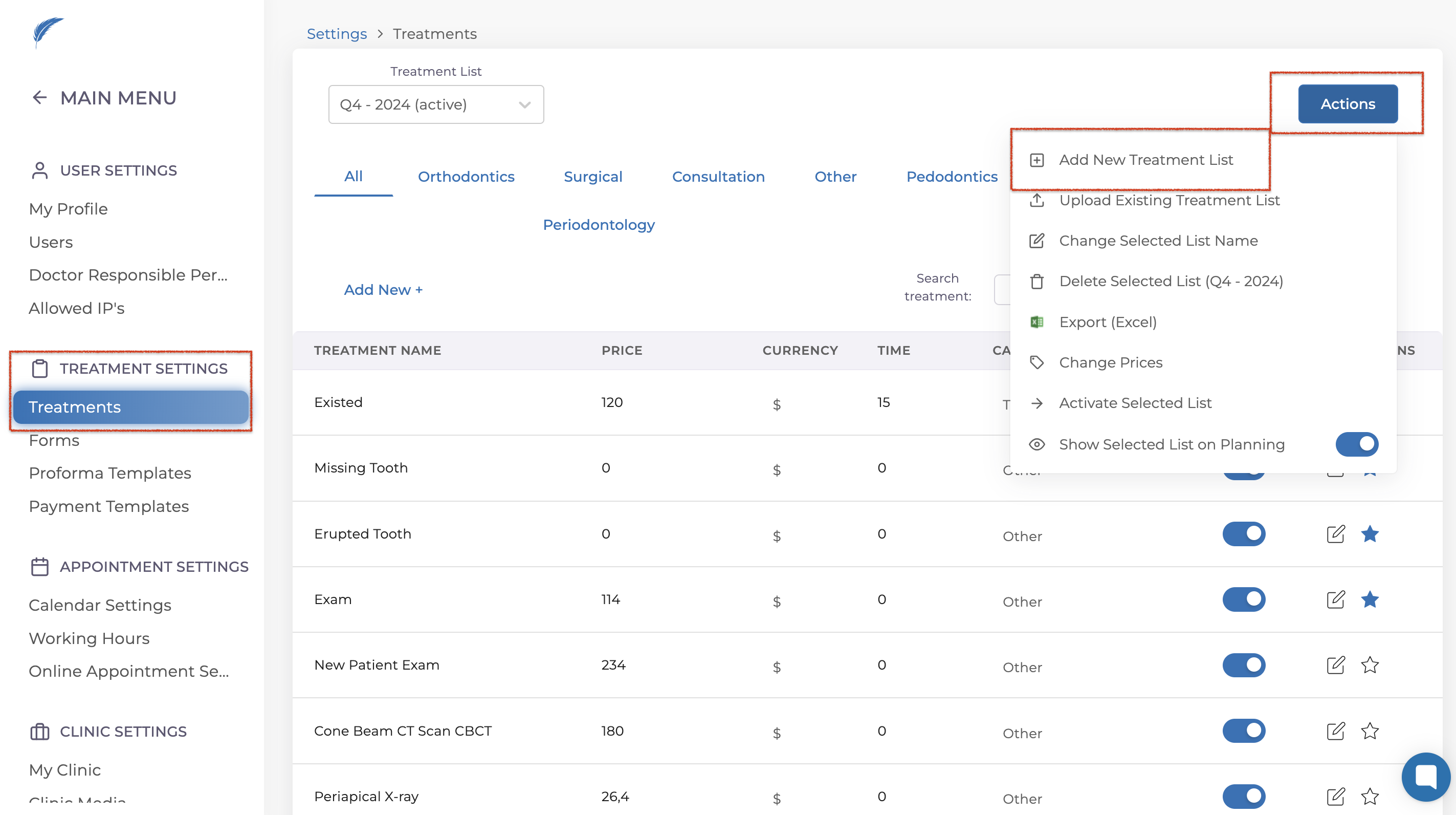 2. Click the "Actions" button and select “Add new treatment list” to create your own list.