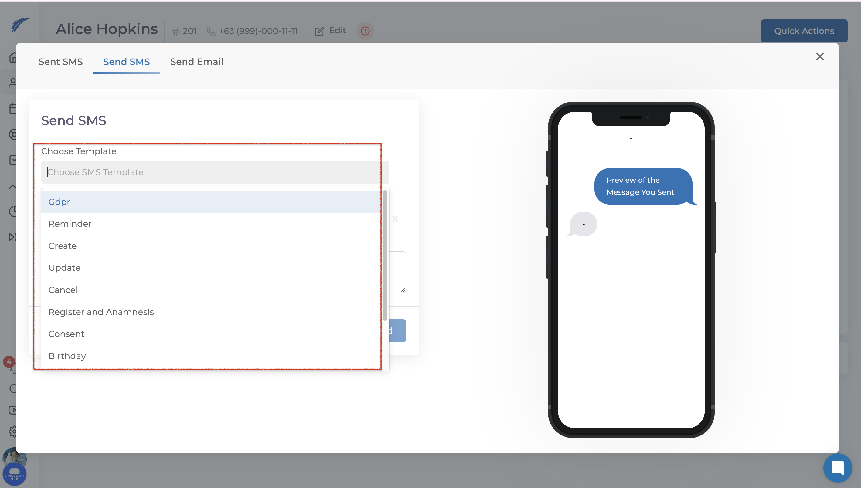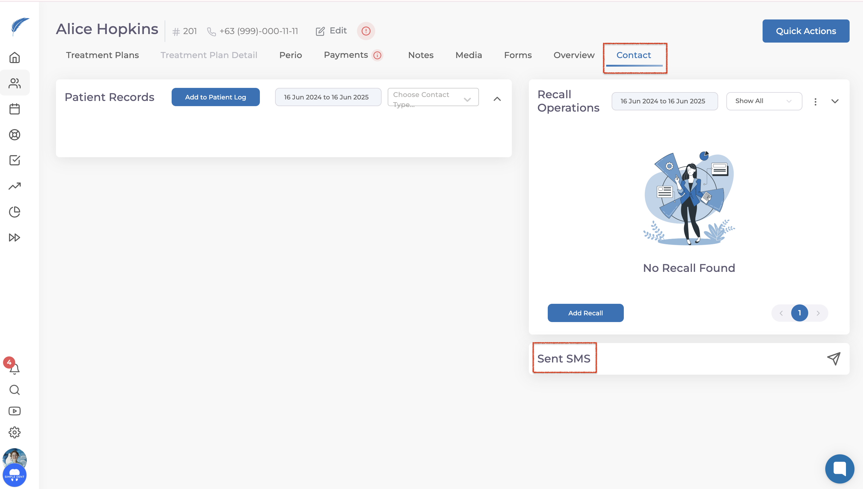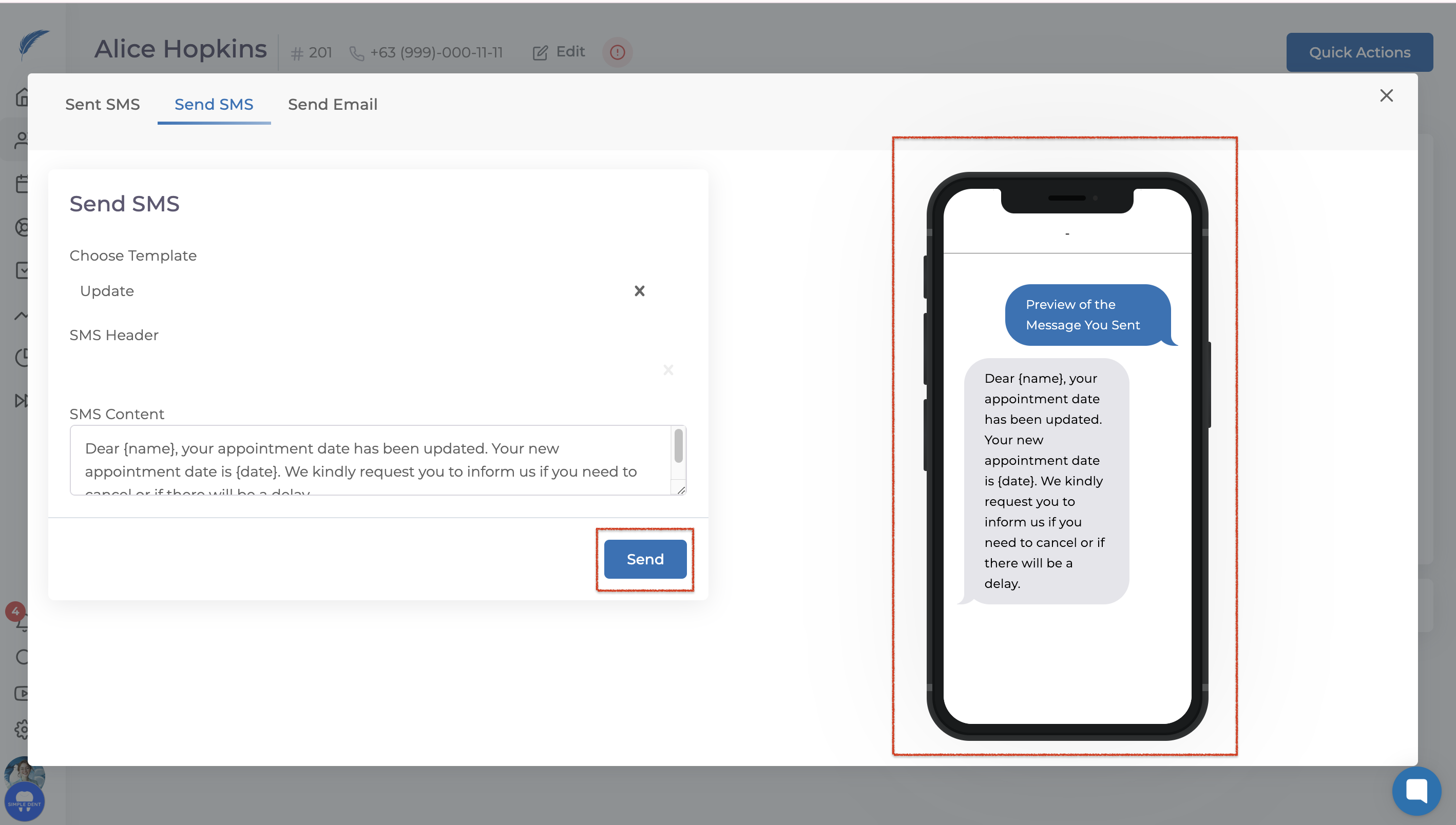To send an SMS, first go to the patient’s profile and click on the Send SMS option under the Contact section.