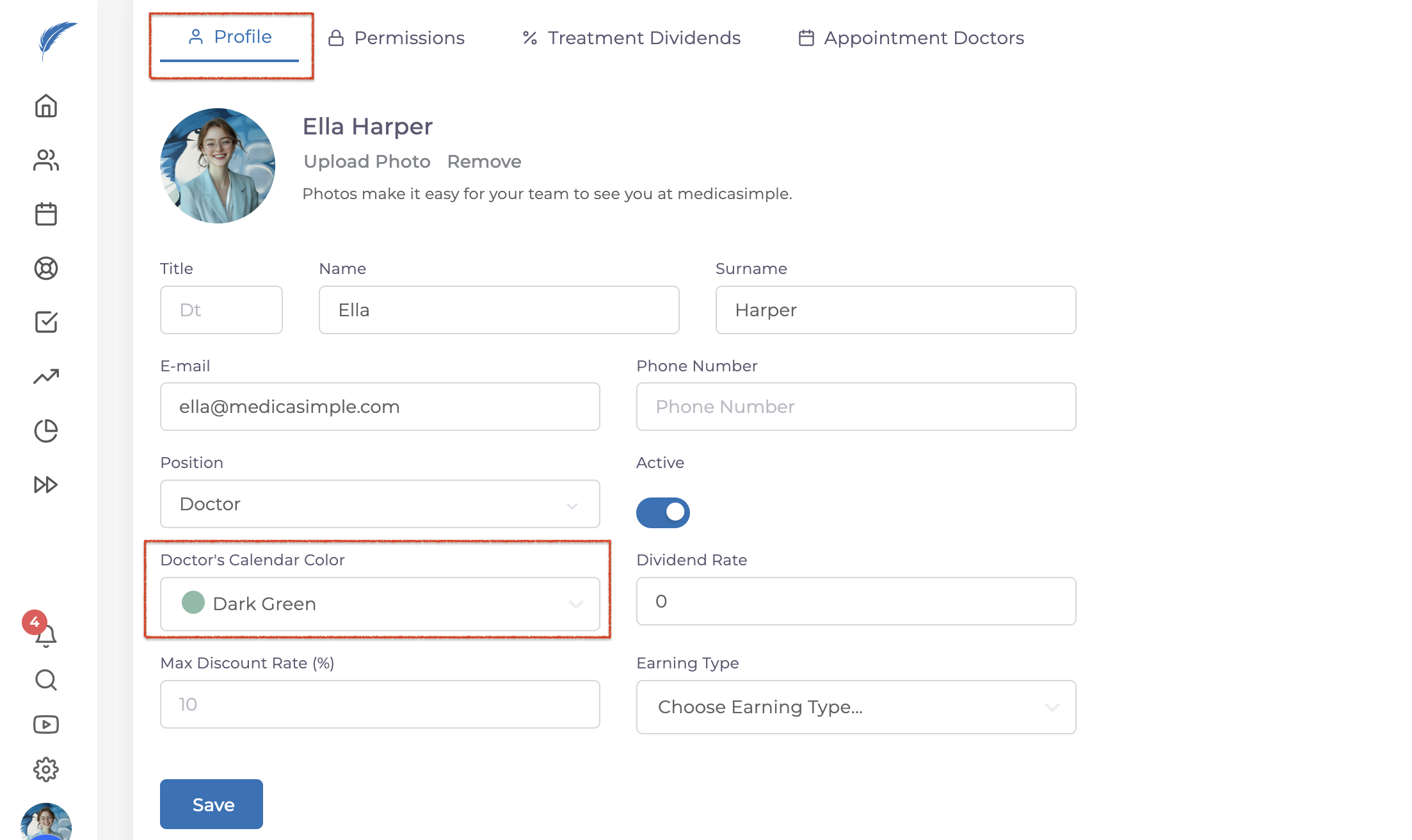 If you use the calendar daily, we recommend utilizing appointment colors. If you are in a multi-doctor clinic and want to use the weekly view, you can color-code it by doctor. Each appointment for the same doctor will appear in a single color according to the color you set. To set doctor colors, you need to go to the profile of the doctor you want to color-code from the users section and set the color.