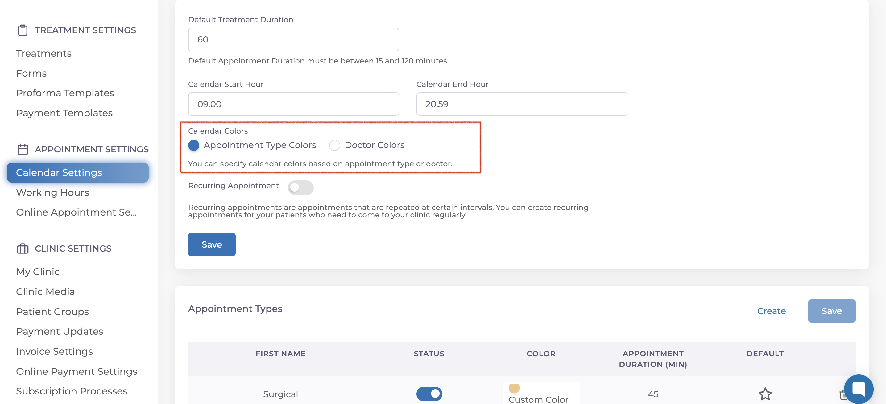 In this article, we will provide information on how to set it up. First, navigate to the Settings - Appointment Settings tab. From there, you can adjust the colors in the calendar according to either appointment types or doctors.