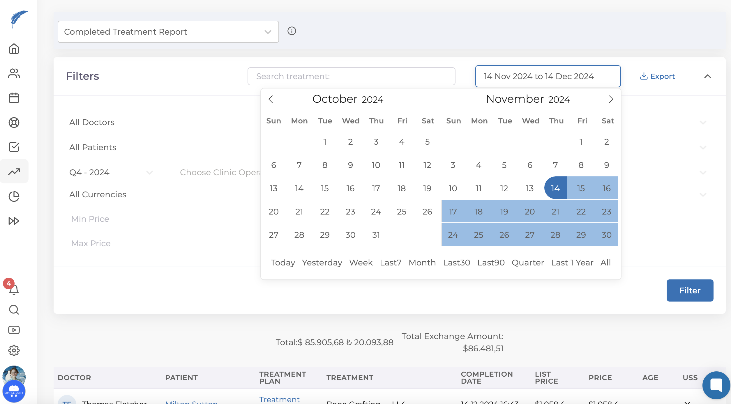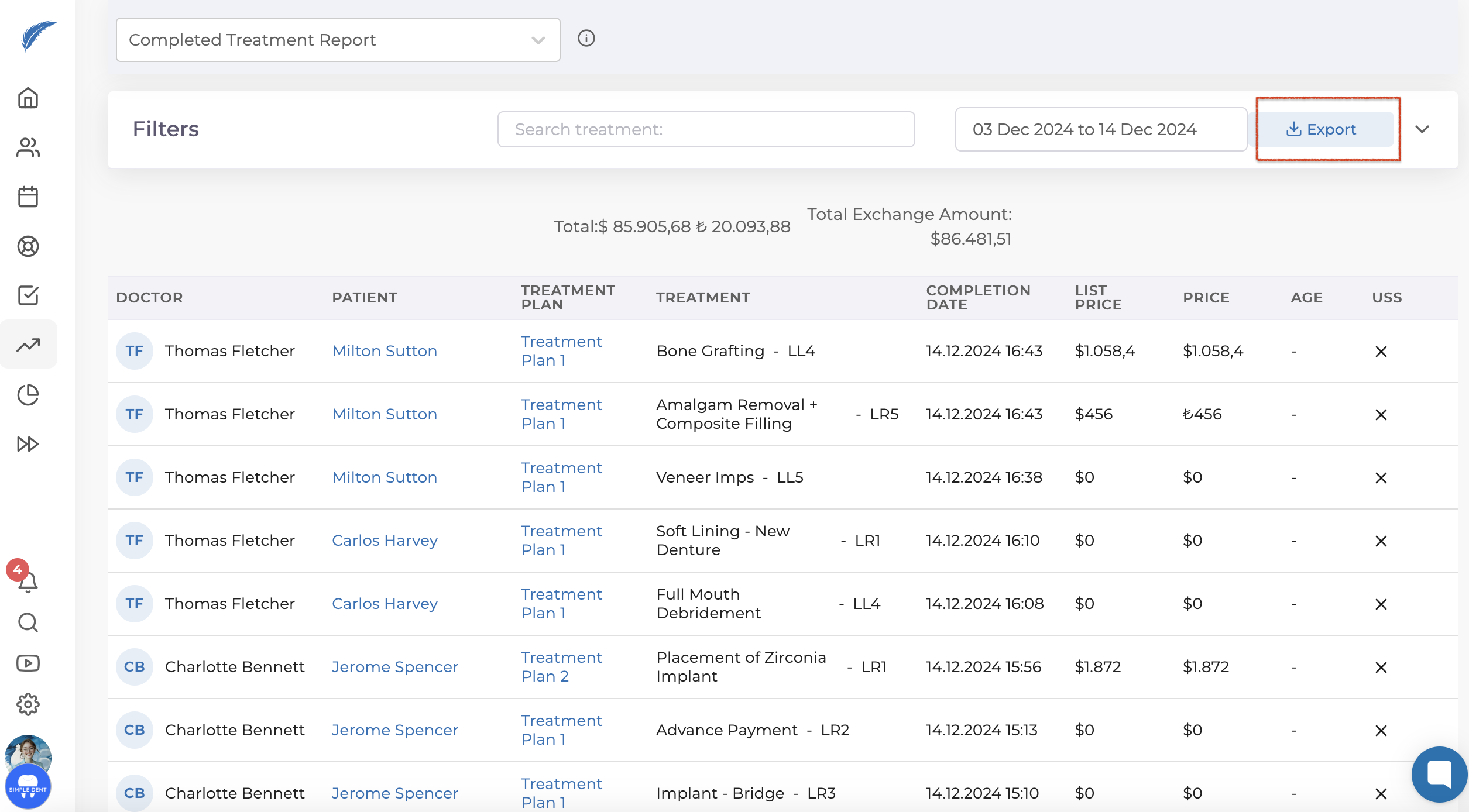 From this area, you can see the total amount of completed treatment plans at the top. You can use the search section as a filter. You can filter by entering the doctor's name, patient's name, or treatment name.