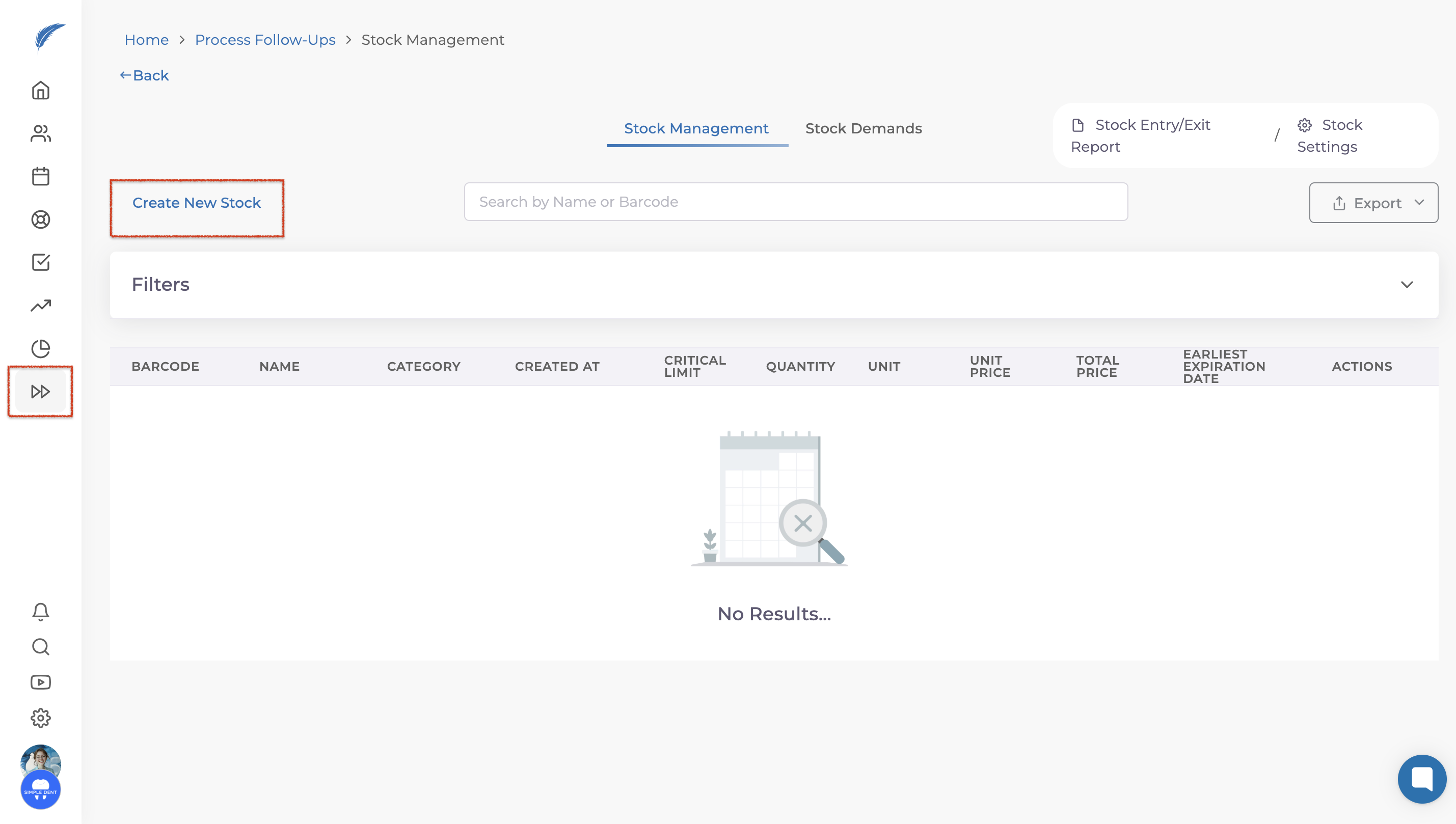 First, go to the Process Follow-Ups screen and navigate to Stock Management. In the top left corner of the page, there is a "Create New Stock" button.