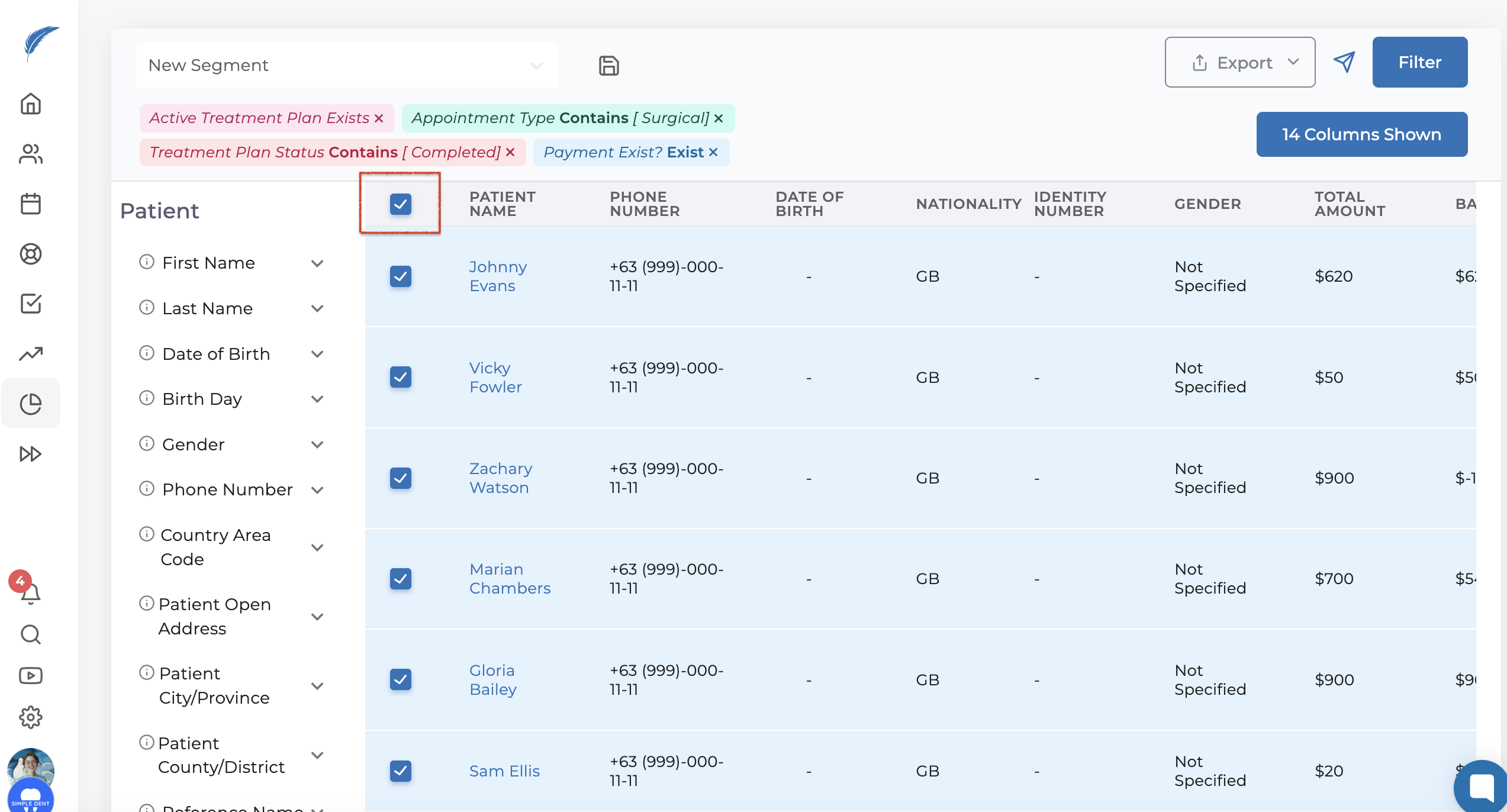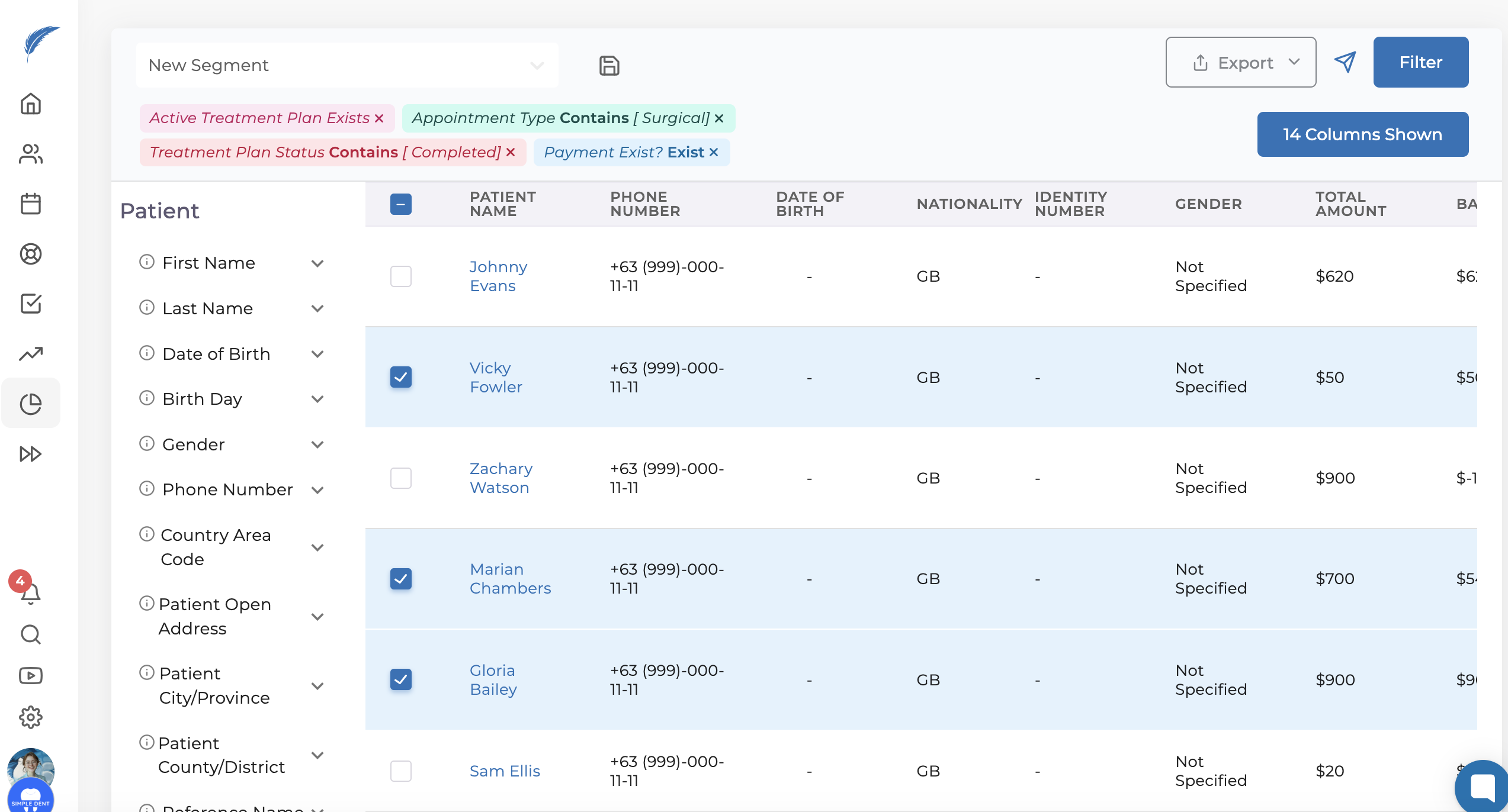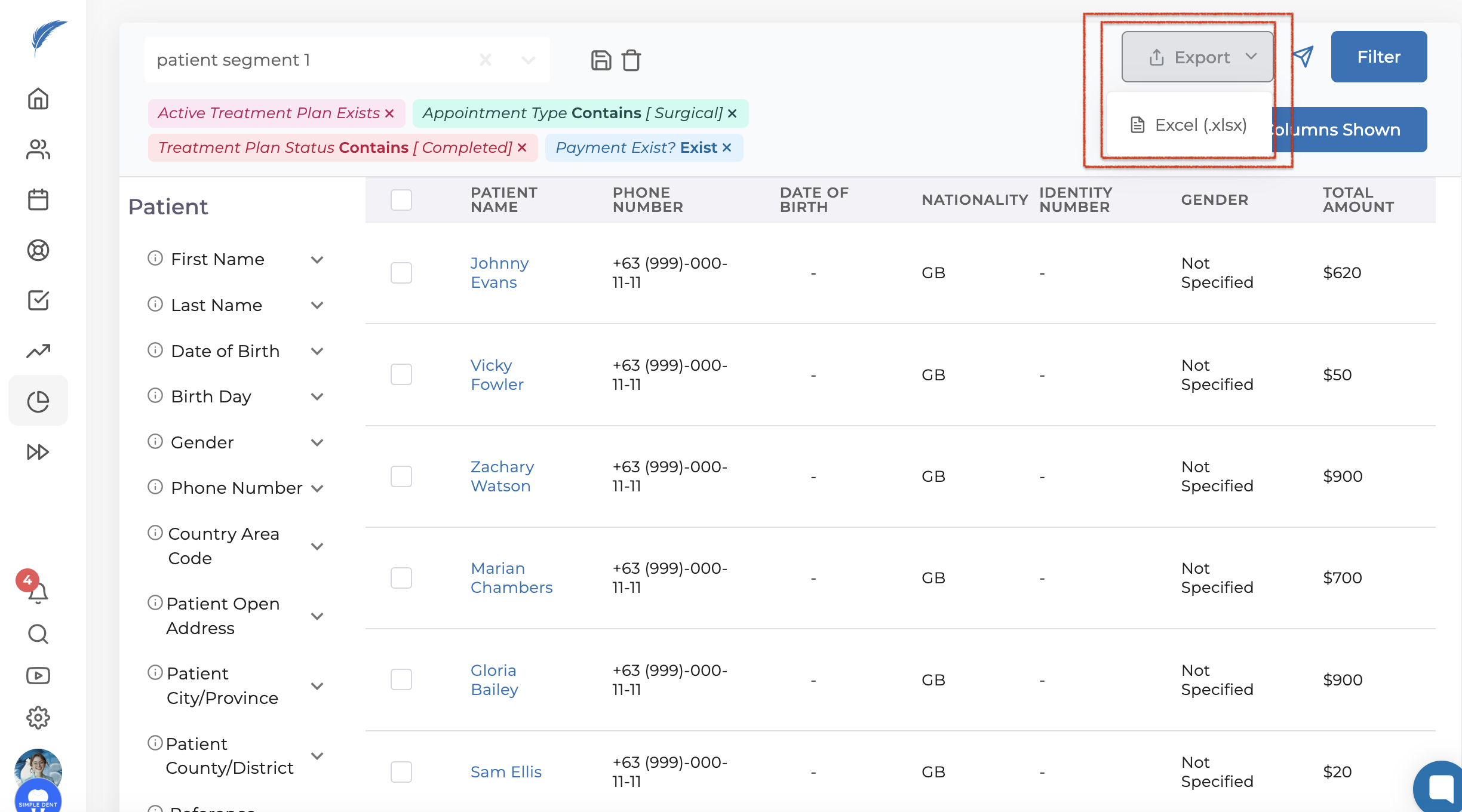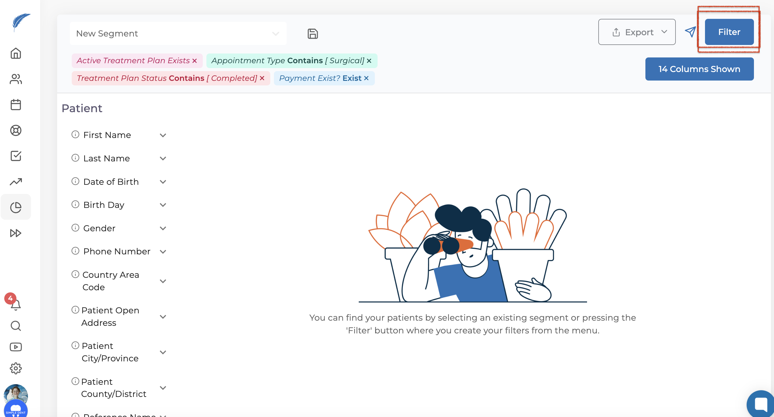 On the opened screen, you will find filtering options on the left side. When filtering patients, you can choose from categories: