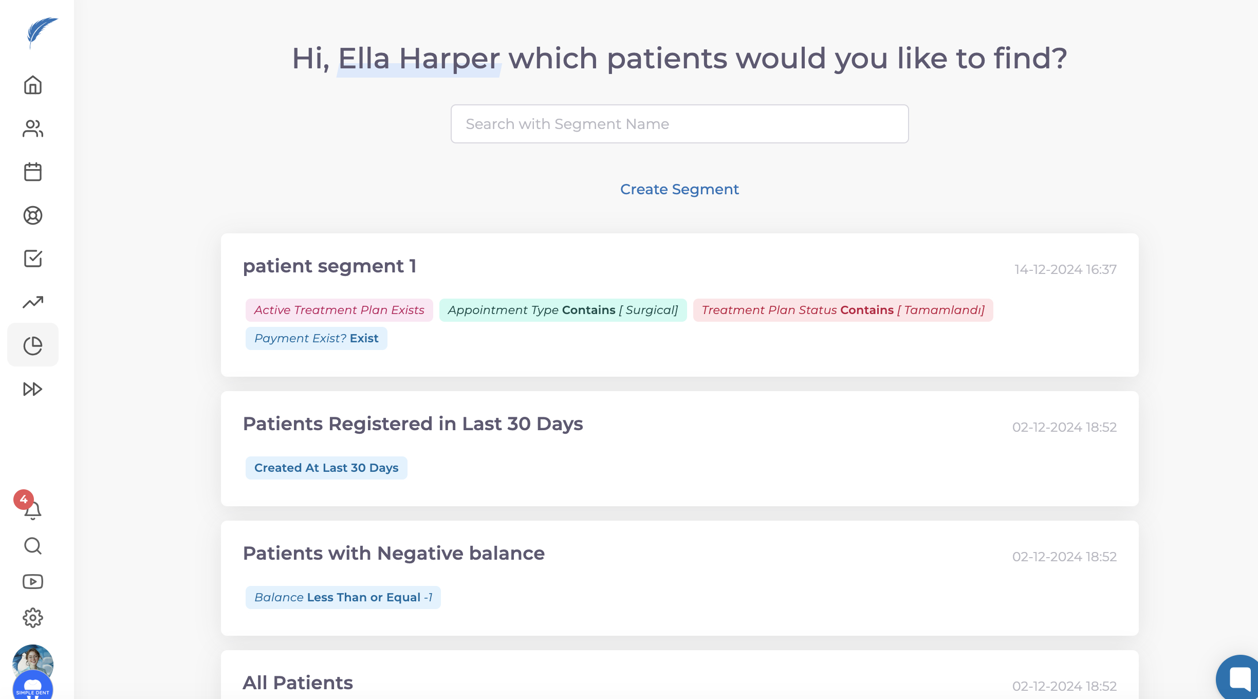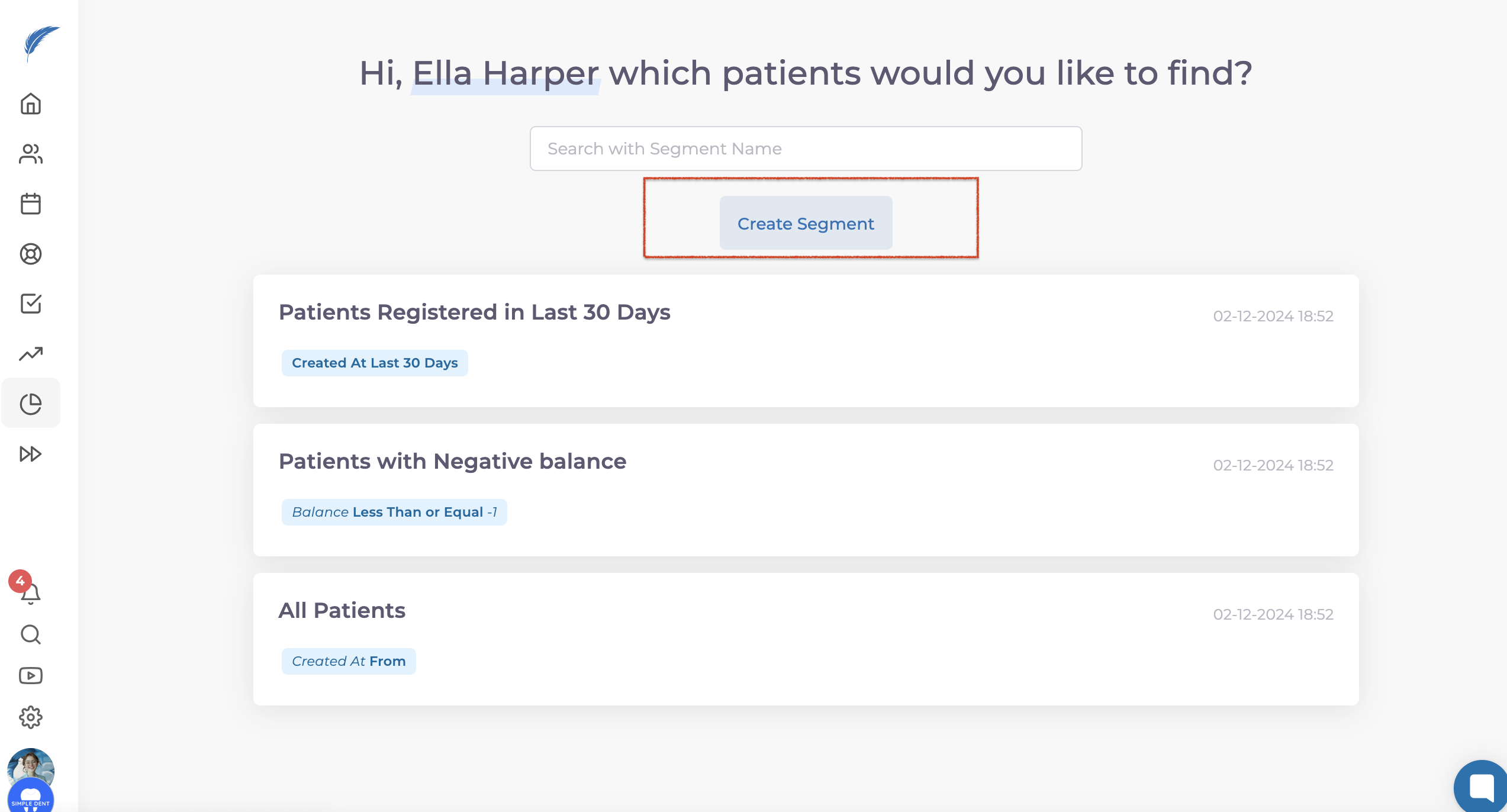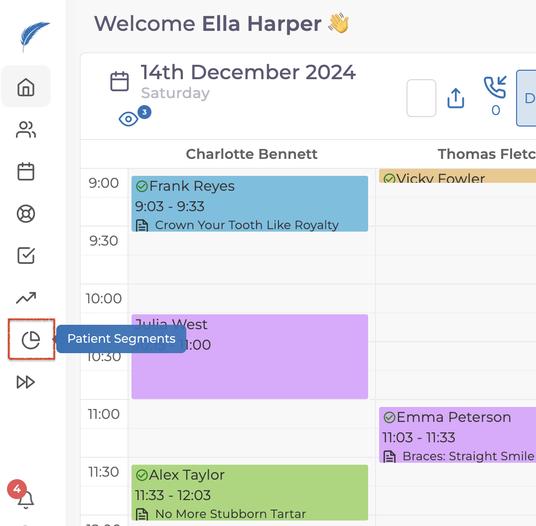 You can access the Patient Segments page by clicking on the pie chart icon located on the left side of your homepage.