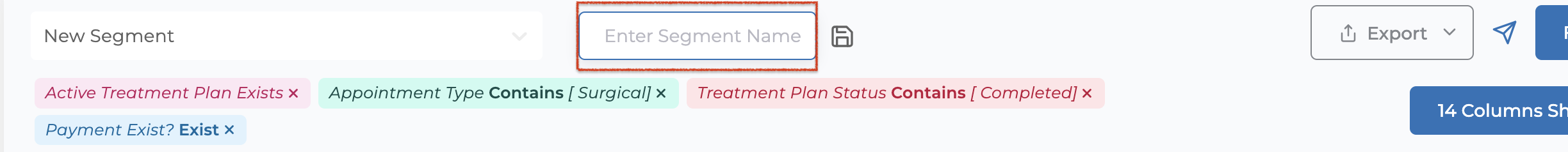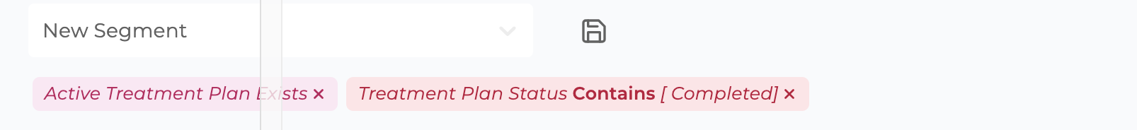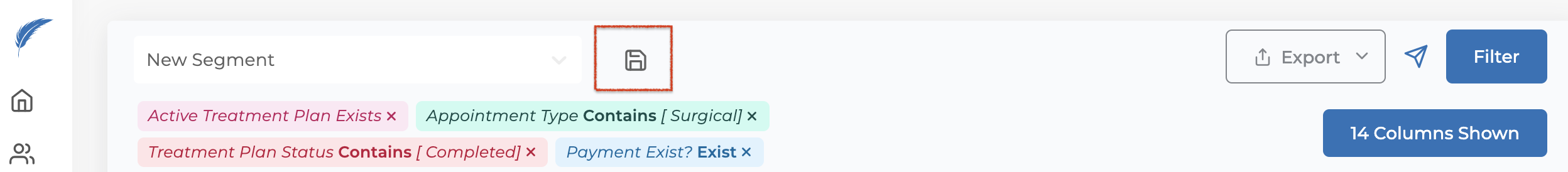 After selecting your filters, click the disk icon located at the far left of the icons at the top of the page. This will bring up a "Enter Segment Name" field. You can name your patient segment here, allowing you to select it from your saved segments for future filtering and viewing.
