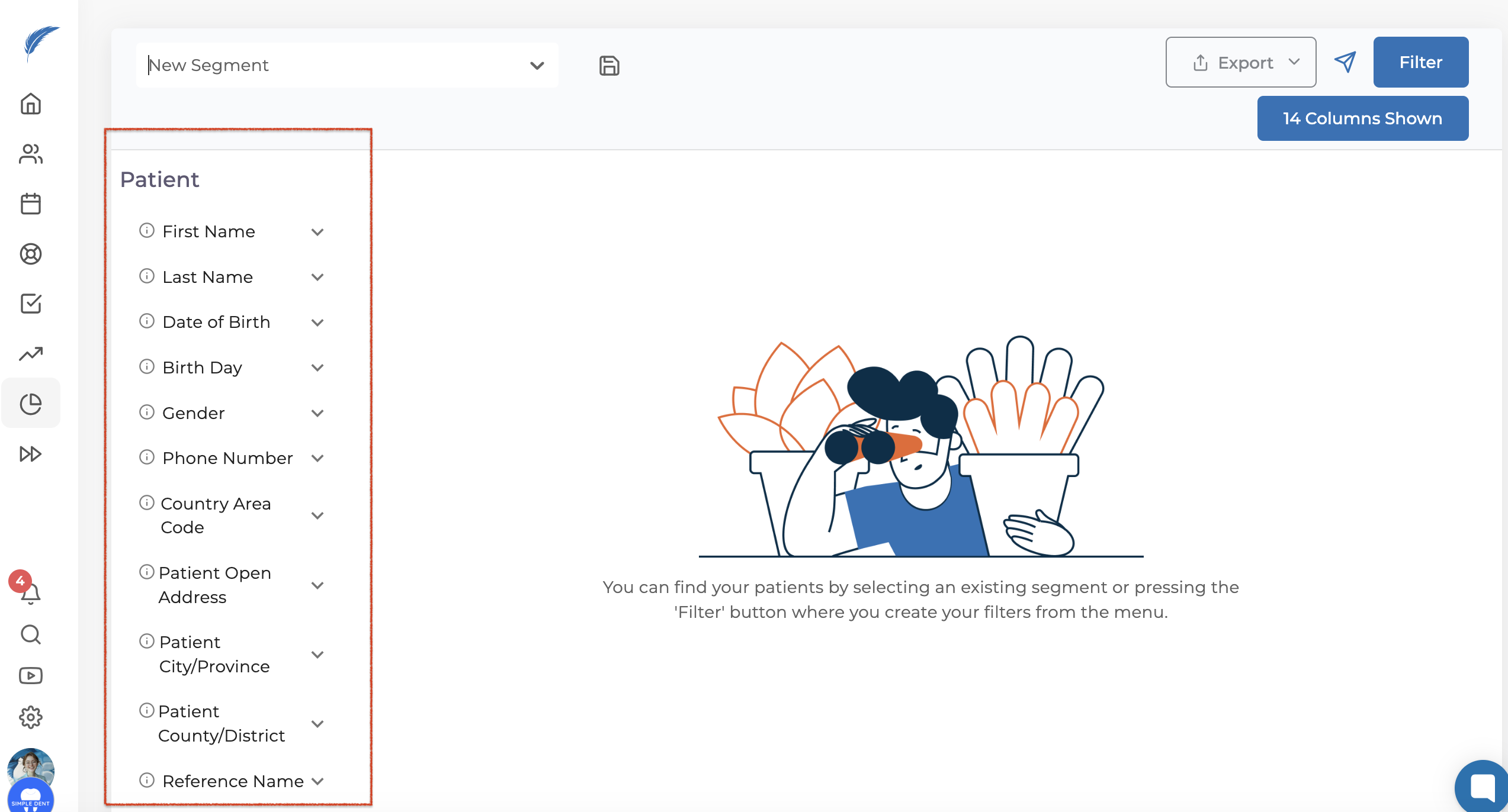 Patient segments are areas where you can apply filters when searching for your patients.
