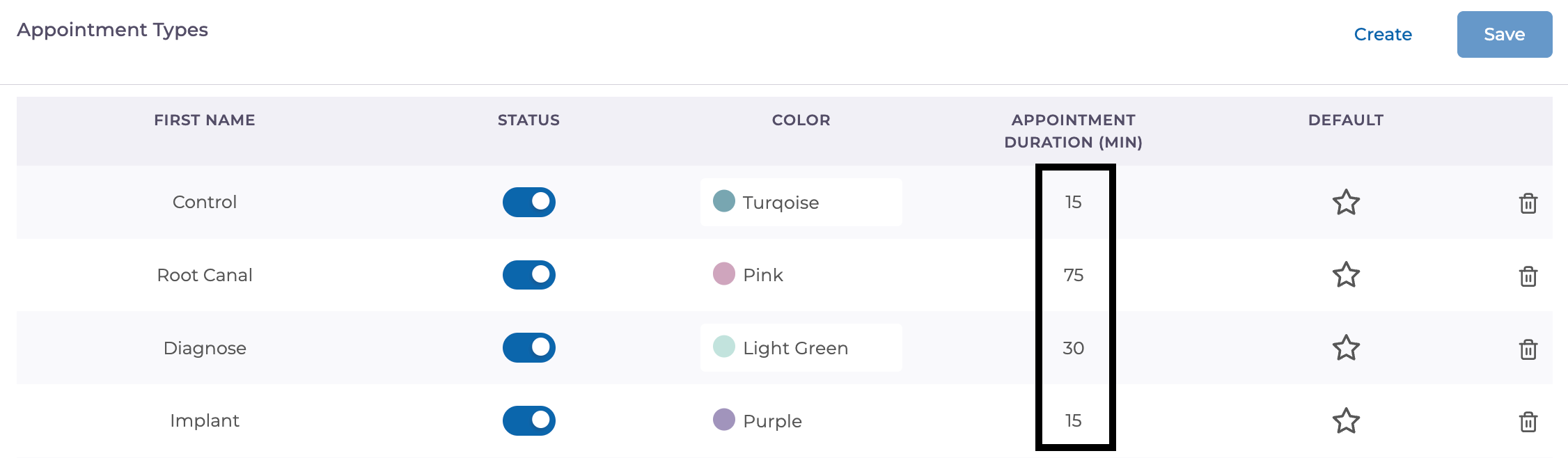 Set default durations for different appointment types to reduce errors and standardize appointment lengths.