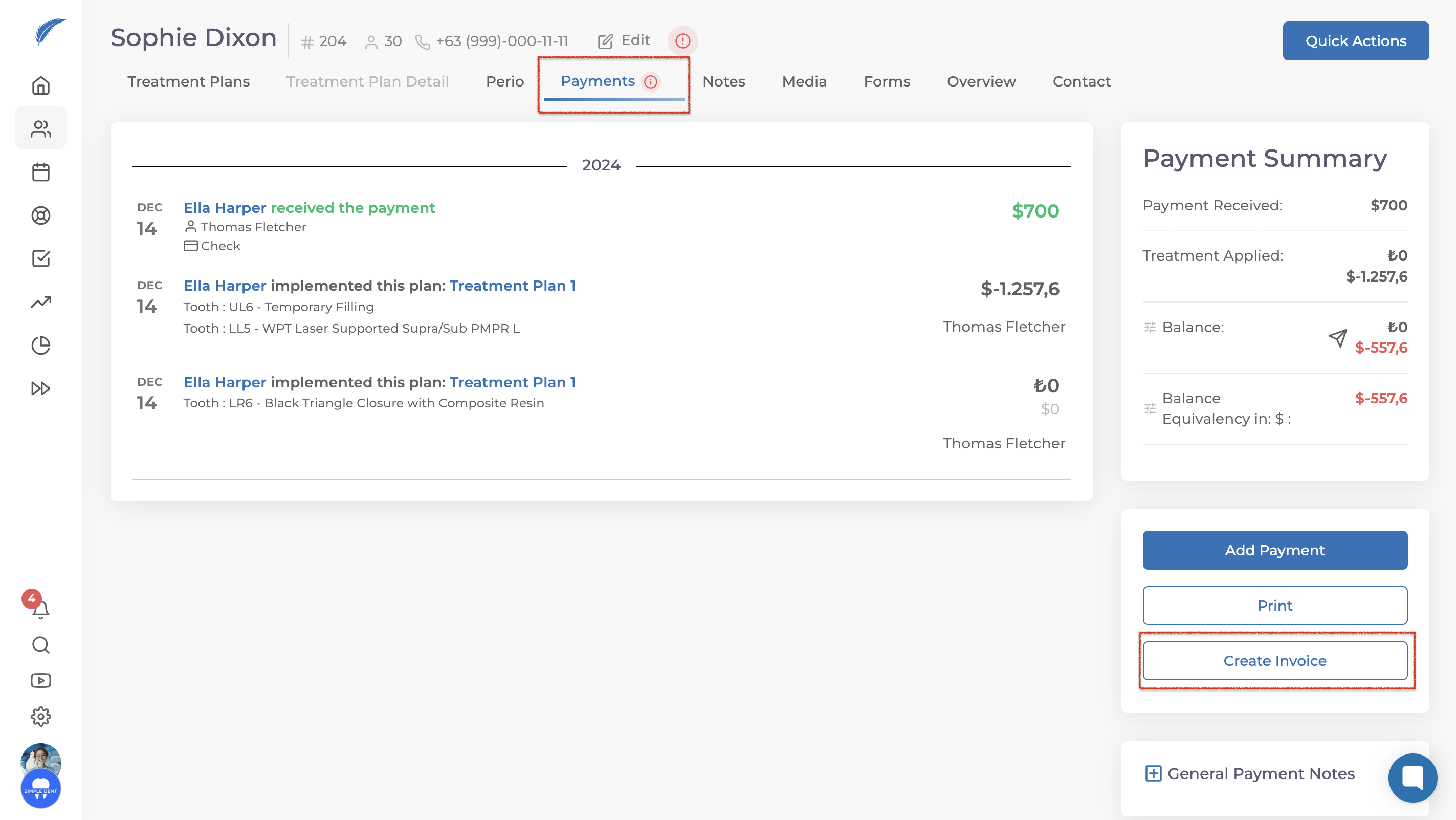 To create an invoice, go to the Payments section from the patient screen. Click on the Create Invoice button located in the bottom right corner. This will open a screen where you can configure your invoice settings.