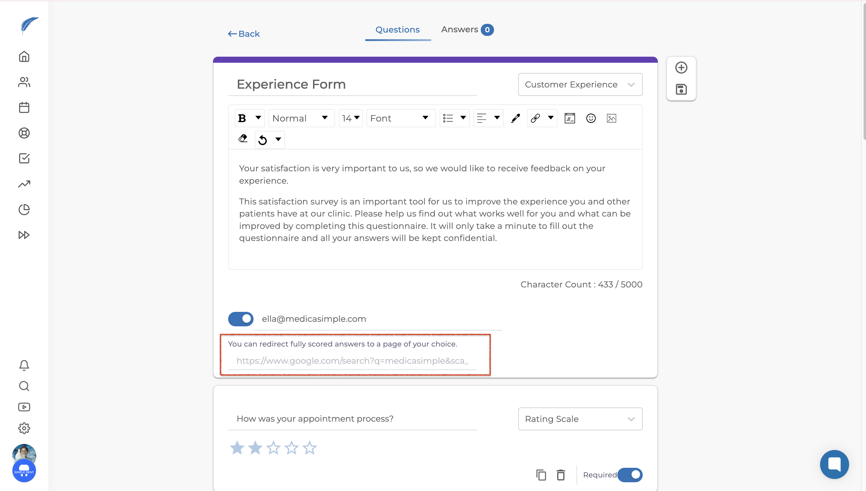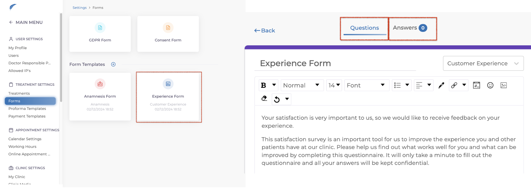 In the Forms section, choose Customer Experience. This is where you can design your form under Questions headline and see patient's answers under the Answers headline.