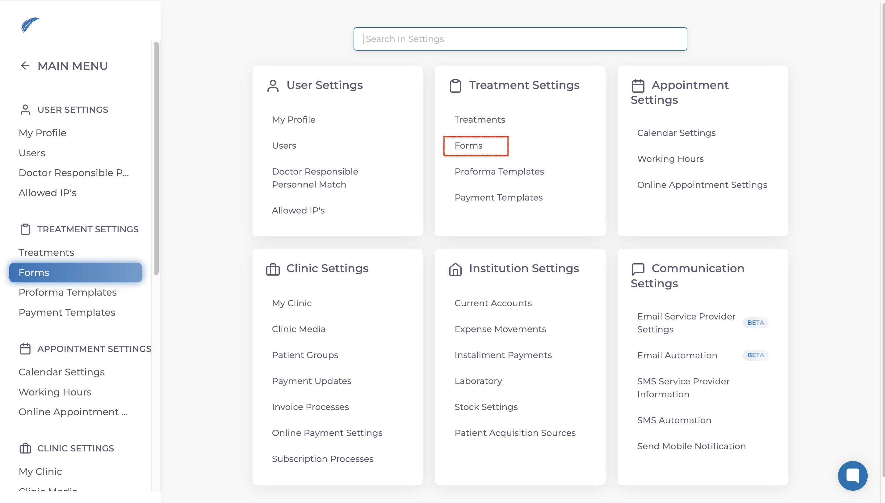 To create a Customer Experience Form, start by going to the Settings. From there, navigate to the Treatment Settings area and select Forms.