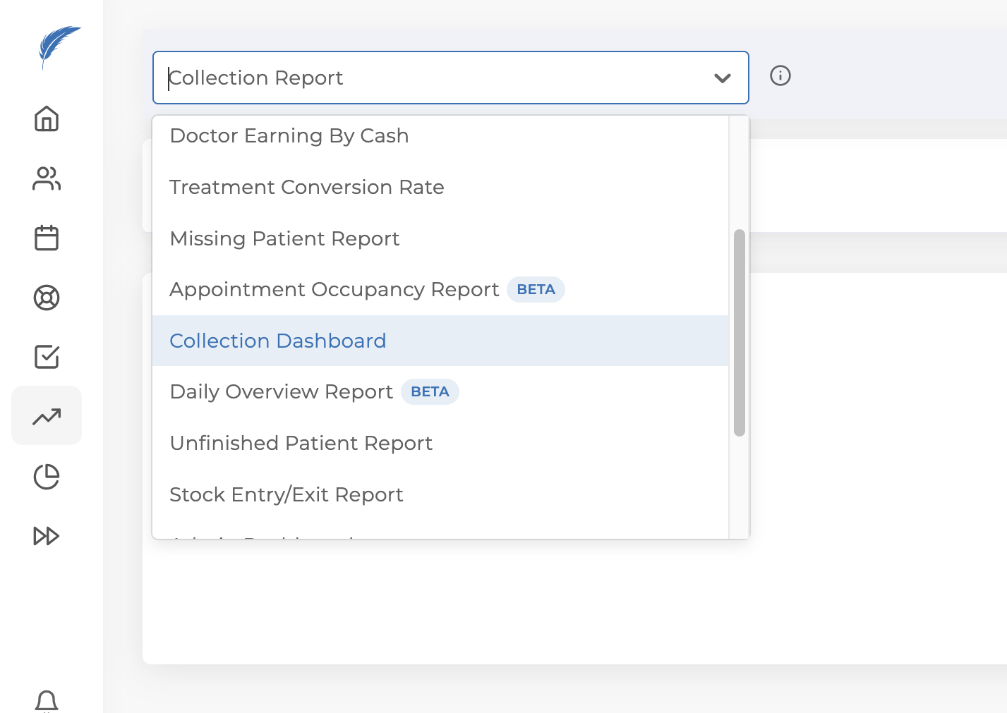 When you click on this icon, you’ll access a page where, from the top left corner, you can explore reports such as Daily Overview Report, Missing Patient Reports, and Expenses Report. These tools are designed to make your clinic management simple and efficient.