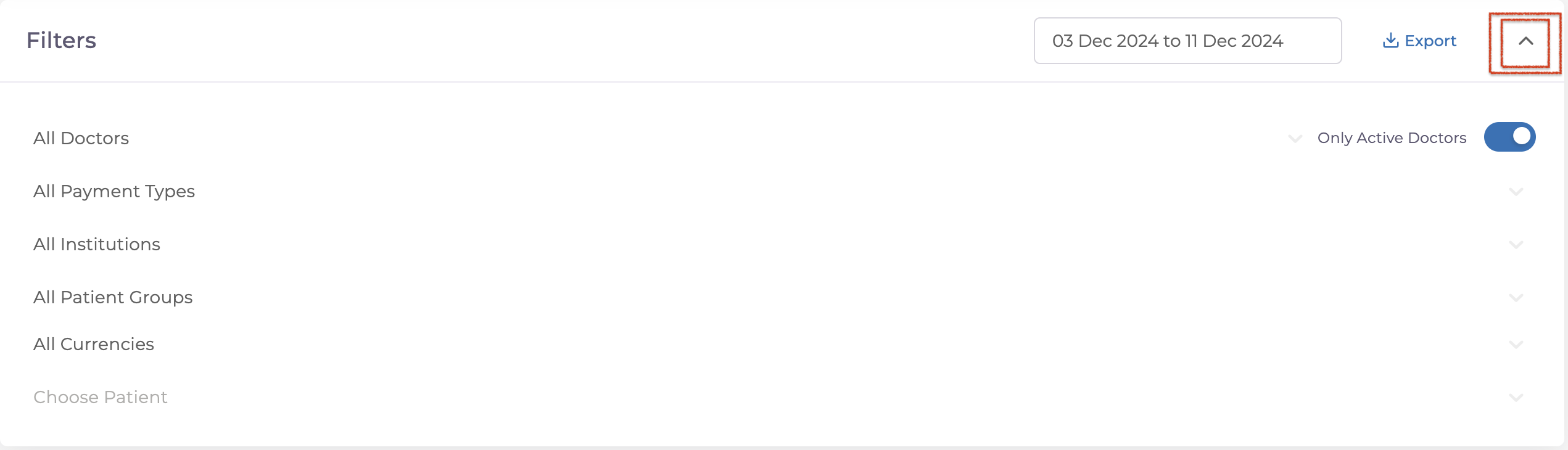 By clicking the arrow located in the top right corner, you can also add filters like Doctors, Payment Types, and Patient Groups to your reports.