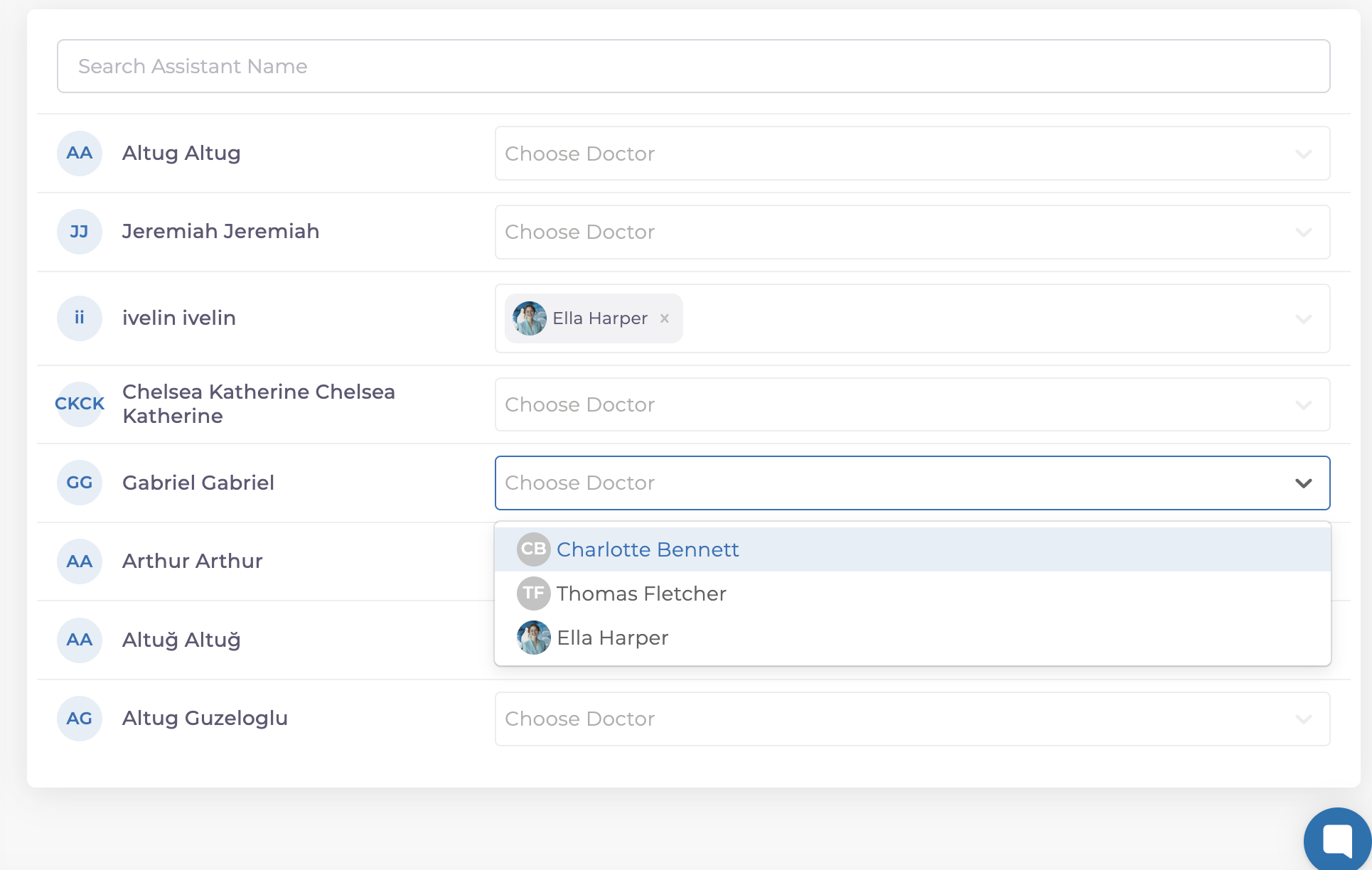 A new screen will display a list of registered assistants on the left. For each assistant, use the Choose Doctor option on the right to assign the relevant doctor.