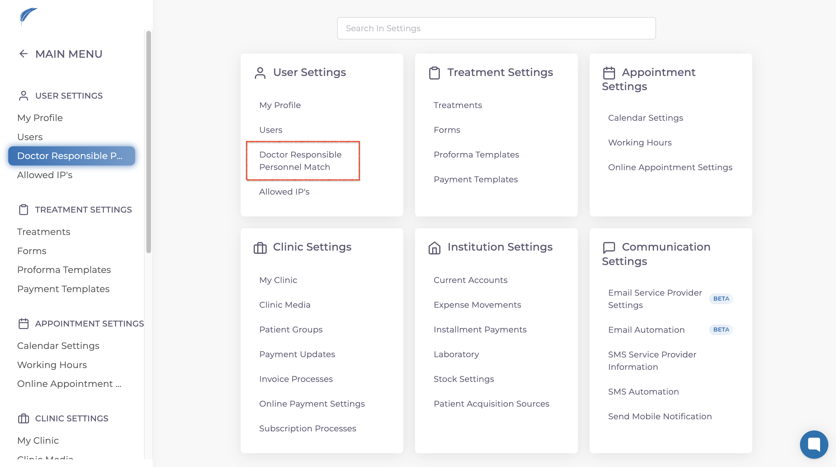 Within the settings menu, scroll down to the User Settings section located in the bottom right corner and click on Doctor-Responsible Personnel Match.