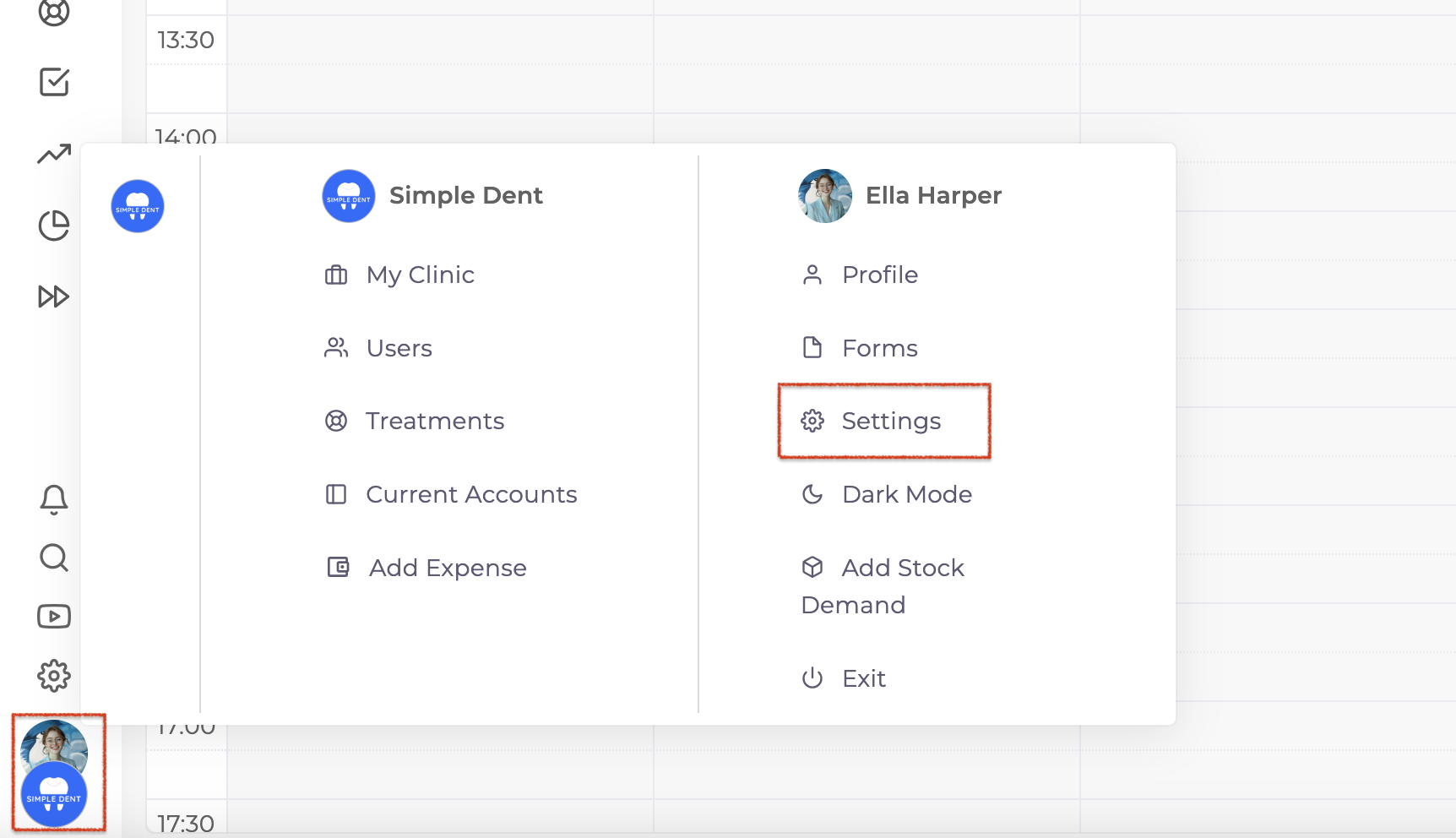 To ensure that notifications sent to doctors also reach their assistants, start by clicking on your clinic logo in the bottom left corner of the screen. From the panel that appears, select Settings.